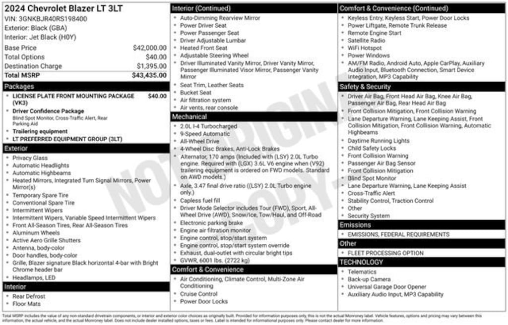 This is one impressive car. I purchased the Chevrolet Blazer with 6 cylinder engine. It has everything I want. Great acceleration, Great styling, Quiet engine, Well equiped, I really like the turn signals in the mirrors, push button start, blind spot monitoring, cross traffic monitoring, Continental Tires, and easy pairing of cell phone. I did not get AWD or GPS. There is nothing, I would change and for the price, a great deal to boot. You won't be disappointed.… - 5.0