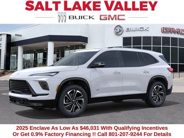 Experience refined comfort in the new Buick Enclave at Salt Lake Valley Buick GMC in Salt Lake City! Buick blends modern luxury, smart technology, and quiet confidence for every drive. Whether itâs a daily commute or a weekend escape, the Enclave makes every mile feel first-class. Call us today at 801-265-1511 to schedule a time to see it ! ----2025 Buick Enclave Sport Touring 4D Sport Utility Summit White 2.5L DOHC AWD --- Please note that the final selling price does not include tax, tag, title, documentation fees, dealer-installed options, or pricing adjustments due to market demand. Financing through GM Financial is required for all discounts to be applied. Special finance offers may not be combined with some factory incentives. While we strive for accuracy, errors may occur, so please verify all information with a customer service representative. For the most accurate pricing, call us at (801) 265-1511 or visit our dealership in person. Prices and payments are subject to change based on manufacturer incentives. ... Sale Price may include dealer discount, $1500 - GM Bonus Cash $500 - Buick & GMC Consumer Cash Program - Price includes $1,000 Down Payment Assistance. Must Finance with GM Financial - Price includes $1,500 trade in allowance program for customers that own a 2019 or newer passenger car or truck with less than 80,000 miles and trade in their vehicle towards the purchase of a new 2025-2026 Buick or GMC. Some restrictions may apply. Contact dealer for details
