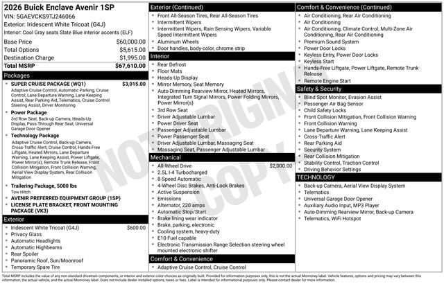 2026 Buick Enclave Avenir 4D Sport Utility iridescent white tricoat 2.5L DOHC AWD --- Please note that the final selling price does not include tax, tag, title, documentation fees, dealer-installed options, or pricing adjustments due to market demand. Financing through GM Financial is required for all discounts to be applied. Special finance offers may not be combined with some factory incentives. While we strive for accuracy, errors may occur, so please verify all information with a customer service representative. For the most accurate pricing, call us at (801) 265-1511 or visit our dealership in person. Prices and payments are subject to change based on manufacturer incentives. ... Sale Price may include dealer discount, $1250 - Buick GMC Bonus Cash $500 - Buick & GMC Consumer Cash Program