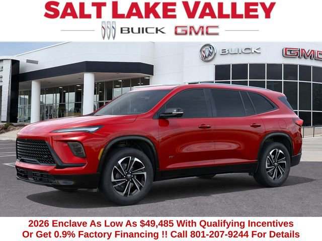 2026 Buick Enclave Sport Touring 4D Sport Utility cherry red tintcoat 2.5L DOHC FWD --- Please note that the final selling price does not include tax, tag, title, documentation fees, dealer-installed options, or pricing adjustments due to market demand. Financing through GM Financial is required for all discounts to be applied. Special finance offers may not be combined with some factory incentives. While we strive for accuracy, errors may occur, so please verify all information with a customer service representative. For the most accurate pricing, call us at (801) 265-1511 or visit our dealership in person. Prices and payments are subject to change based on manufacturer incentives. ... Sale Price may include dealer discount, $2500 - Buick GMC Bonus Cash $500 - Buick & GMC Consumer Cash Program - Price includes $1,000 Down Payment Assistance. Must Finance with GM Financial - Price includes $1,500 trade in allowance program for customers that own a 2019 or newer passenger car or truck with less than 80,000 miles and trade in their vehicle towards the purchase of a new 2025-2026 Buick or GMC. Some restrictions may apply. Contact dealer for details