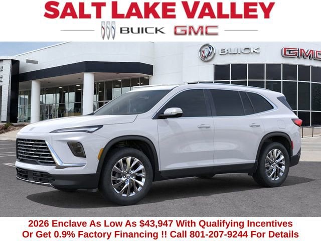 2026 Buick Enclave Preferred 4D Sport Utility Summit White 2.5L DOHC AWD --- Please note that the final selling price does not include tax, tag, title, documentation fees, dealer-installed options, or pricing adjustments due to market demand. Financing through GM Financial is required for all discounts to be applied. Special finance offers may not be combined with some factory incentives. While we strive for accuracy, errors may occur, so please verify all information with a customer service representative. For the most accurate pricing, call us at (801) 265-1511 or visit our dealership in person. Prices and payments are subject to change based on manufacturer incentives. ... Sale Price may include dealer discount, $2500 - Buick GMC Bonus Cash $500 - Buick & GMC Consumer Cash Program - Price includes $1,000 Down Payment Assistance. Must Finance with GM Financial - Price includes $1,500 trade in allowance program for customers that own a 2019 or newer passenger car or truck with less than 80,000 miles and trade in their vehicle towards the purchase of a new 2025-2026 Buick or GMC. Some restrictions may apply. Contact dealer for details