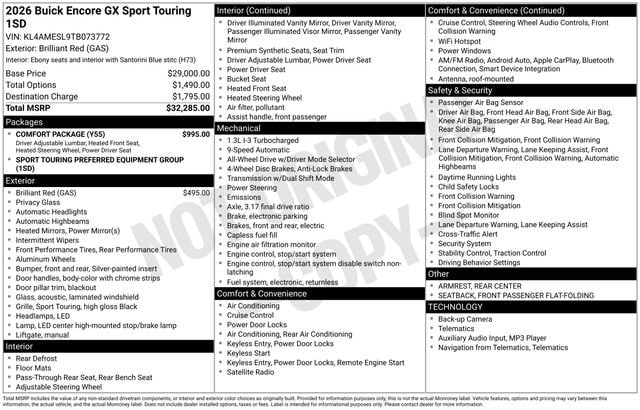 2026 Buick Encore GX Sport Touring 4D Sport Utility Brilliant Red ECOTEC 1.3L Turbo AWD 26/28 City/Highway MPG --- Please note that the final selling price does not include tax, tag, title, documentation fees, dealer-installed options, or pricing adjustments due to market demand. Financing through GM Financial is required for all discounts to be applied. Special finance offers may not be combined with some factory incentives. While we strive for accuracy, errors may occur, so please verify all information with a customer service representative. For the most accurate pricing, call us at (801) 265-1511 or visit our dealership in person. Prices and payments are subject to change based on manufacturer incentives. ... Sale Price may include dealer discount, $2000 - Buick GMC Bonus Cash