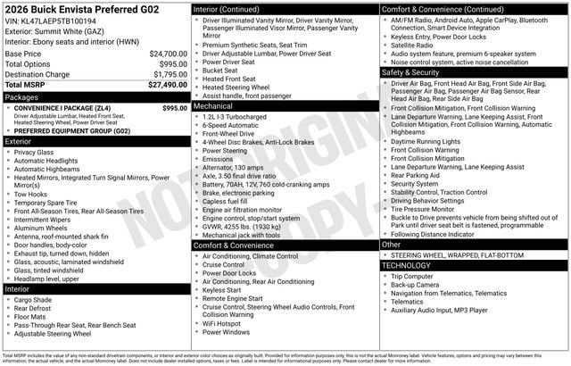 2026 Buick Envista Preferred 4D Sport Utility Summit White ECOTEC 1.2L Turbo FWD 28/32 City/Highway MPG --- Please note that the final selling price does not include tax, tag, title, documentation fees, dealer-installed options, or pricing adjustments due to market demand. Financing through GM Financial is required for all discounts to be applied. Special finance offers may not be combined with some factory incentives. While we strive for accuracy, errors may occur, so please verify all information with a customer service representative. For the most accurate pricing, call us at (801) 265-1511 or visit our dealership in person. Prices and payments are subject to change based on manufacturer incentives. ... Sale Price may include dealer discount, $750 - Buick GMC Bonus Cash