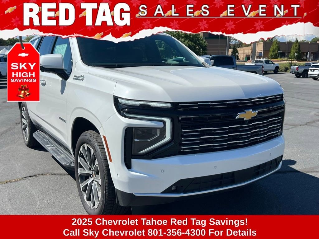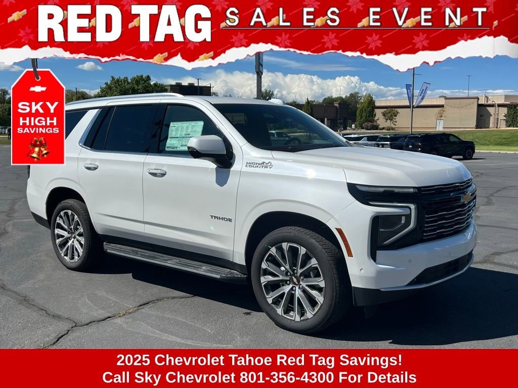 Experience the new Chevrolet Tahoe, available now at Sky Chevrolet of Provo! With bold design, advanced technology, and dependable performance, Chevrolet makes every mile more exciting. From Utah Valleyâs city streets to mountain canyon drives, the Tahoe is built to handle it all with confidence. Call 801-356-4300 today to schedule your test drive and see what makes it stand out! Iridescent Pearl Tricoat 2025 Chevrolet Tahoe High Country 4WD 10-Speed Automatic with Overdrive EcoTec3 6.2L V8 4WD, Jet Black Leather. Price includes: $1000 - Chevrolet Consumer Cash Program $1,000 Down Payment Assistance. Must Finance with GM Financial. $1,500 trade in allowance program for customers that own a 2018 or newer passenger car or truck with less than 80,000 miles and trade in their vehicle towards the purchase of a new 2025-2026 New Chevrolet. Some restrictions may apply. Contact dealer for details.