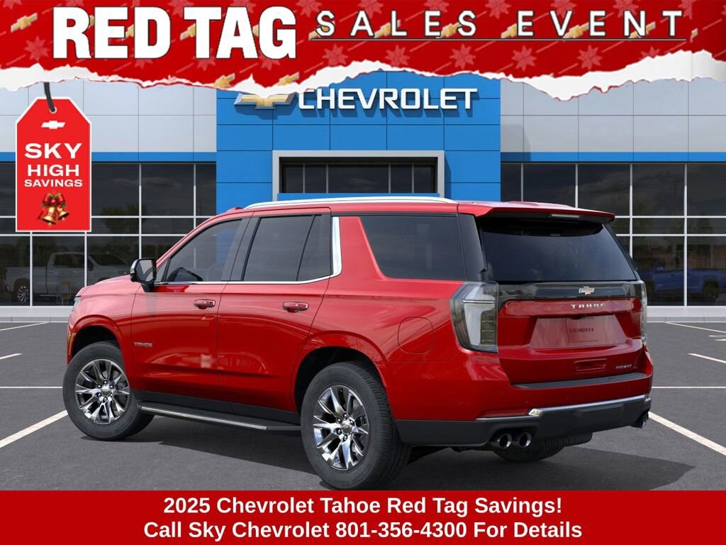 Experience the new Chevrolet Tahoe, available now at Sky Chevrolet of Provo! With bold design, advanced technology, and dependable performance, Chevrolet makes every mile more exciting. From Utah Valleyâs city streets to mountain canyon drives, the Tahoe is built to handle it all with confidence. Call 801-356-4300 today to schedule your test drive and see what makes it stand out! Radiant Red Tintcoat 2025 Chevrolet Tahoe Premier 4WD 10-Speed Automatic with Overdrive EcoTec3 5.3L V8 4WD, Black Leather. Price includes: $1000 - Chevrolet Consumer Cash Program $1,000 Down Payment Assistance. Must Finance with GM Financial. $1,500 trade in allowance program for customers that own a 2018 or newer passenger car or truck with less than 80,000 miles and trade in their vehicle towards the purchase of a new 2025-2026 New Chevrolet. Some restrictions may apply. Contact dealer for details.