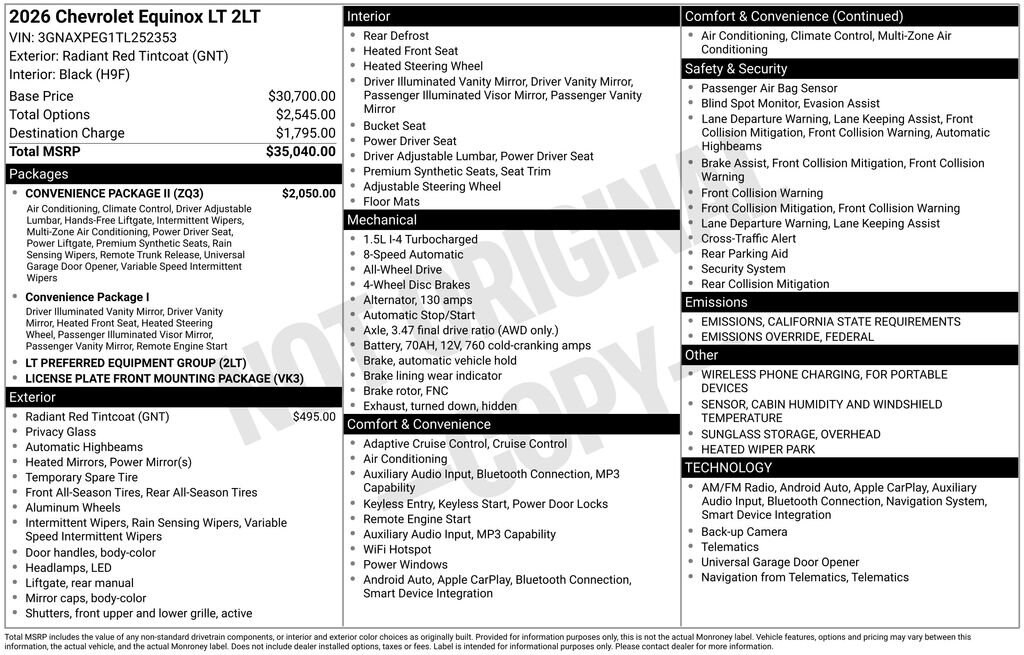 Experience the new Chevrolet Equinox, available now at Sky Chevrolet of Provo! With bold design, advanced technology, and dependable performance, Chevrolet makes every mile more exciting. From Utah Valleyâs city streets to mountain canyon drives, the Equinox is built to handle it all with confidence. Call 801-356-4300 today to schedule your test drive and see what makes it stand out! Radiant Red Tintcoat 2026 Chevrolet Equinox LT AWD 8-Speed Automatic 1.5L DOHC AWD.