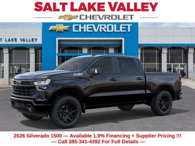 Recent Arrival! Discover the new Chevrolet Silverado 1500 at Salt Lake Valley Chevrolet in Salt Lake City! With bold design, modern technology, and reliable performance, Chevrolet makes every drive exciting. Whether itâs city streets or canyon roads, the Silverado 1500 is ready for anything. Call us today at 801-969-8221 to schedule a time to see it! --- 2026 Chevrolet Silverado 1500 Black EcoTec3 5.3L V8 --- Final price excludes tax, tag, title, documentation fees, dealer-installed options, and any market-based pricing adjustments. Financing through GM Financial is required for all discounts to apply. Special finance offers may not be combined with certain factory incentives. While we strive for accuracy, errors may occur please verify all information with a sales representative. For the most accurate pricing, call (801) 969-8221 or visit us in person. Prices and payments are subject to change based on manufacturer incentives. - Price includes - $1500 - Chevrolet Bonus Cash $3250 - Chevrolet Consumer Cash Program $1,206 - - Price includes $1,500 Trade-In Allowance for customers trading a 2019 or newer passenger car or truck with under 80,000 miles toward a new 2025 2026 Chevrolet. Branded or salvage title vehicles do not qualify. Some restrictions apply. See dealer for details.