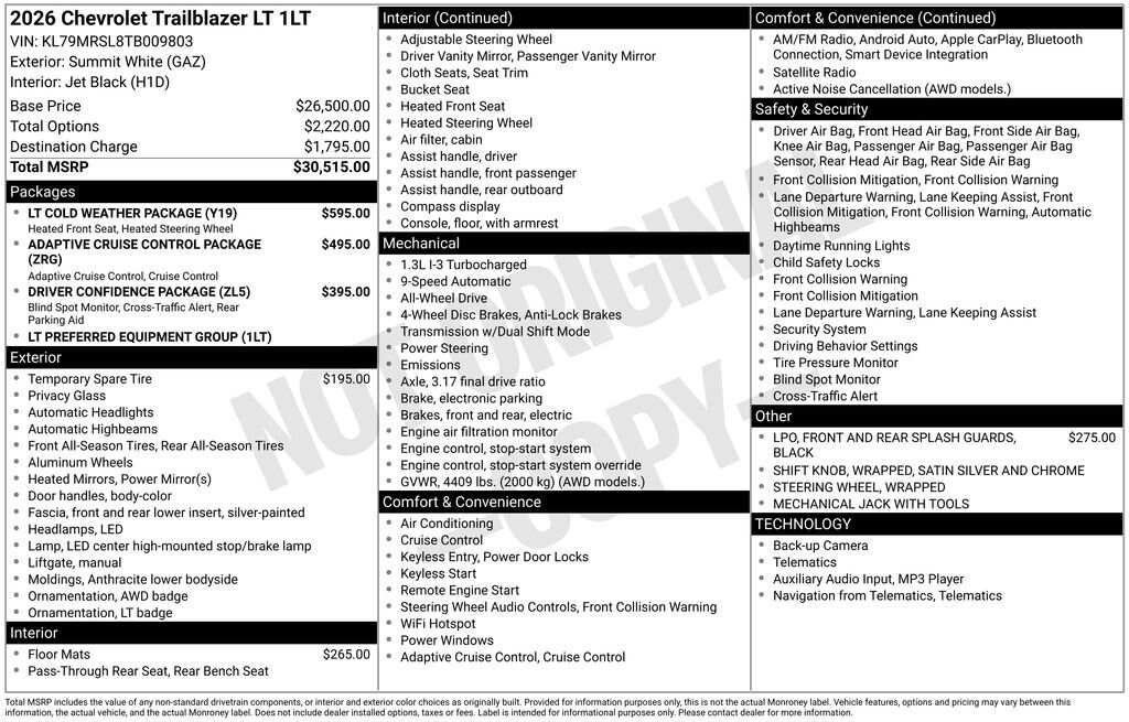 Experience the new Chevrolet TrailBlazer, available now at Sky Chevrolet of Provo! With bold design, advanced technology, and dependable performance, Chevrolet makes every mile more exciting. From Utah Valleyâs city streets to mountain canyon drives, the TrailBlazer is built to handle it all with confidence. Call 801-356-4300 today to schedule your test drive and see what makes it stand out! Summit White 2026 Chevrolet TrailBlazer LT AWD 9-Speed Automatic 1.3L I3 Turbocharged DOHC 12V LEV3-SULEV30 155hpRecent Arrival! 26/29 City/Highway MPG