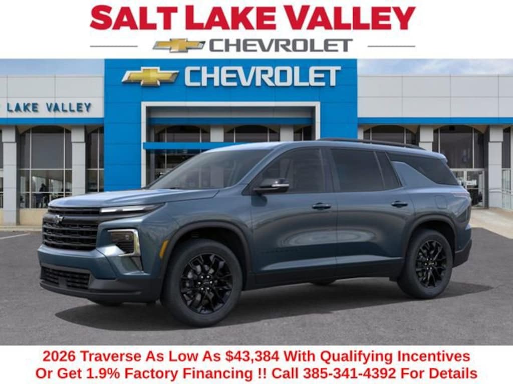 Recent Arrival! Discover the new Chevrolet Traverse at Salt Lake Valley Chevrolet in Salt Lake City! With bold design, modern technology, and reliable performance, Chevrolet makes every drive exciting. Whether itâs city streets or canyon roads, the Traverse is ready for anything. Call us today at 801-969-8221 to schedule a time to see it! --- 2026 Chevrolet Traverse Lakeshore Blue Metallic 2.5L DOHC --- Final price excludes tax, tag, title, documentation fees, dealer-installed options, and any market-based pricing adjustments. Financing through GM Financial is required for all discounts to apply. Special finance offers may not be combined with certain factory incentives. While we strive for accuracy, errors may occur please verify all information with a sales representative. For the most accurate pricing, call (801) 969-8221 or visit us in person. Prices and payments are subject to change based on manufacturer incentives. - Price includes $1,000 Down Payment Assistance. Must Finance with GM Financial - Price includes $1,500 trade in allowance program for customers that own a 2018 or newer passenger car or truck with less than 80,000 miles and trade in their vehicle towards the purchase of a new 2024-2025 Chevrolet. Some restrictions may apply. Contact dealer for details