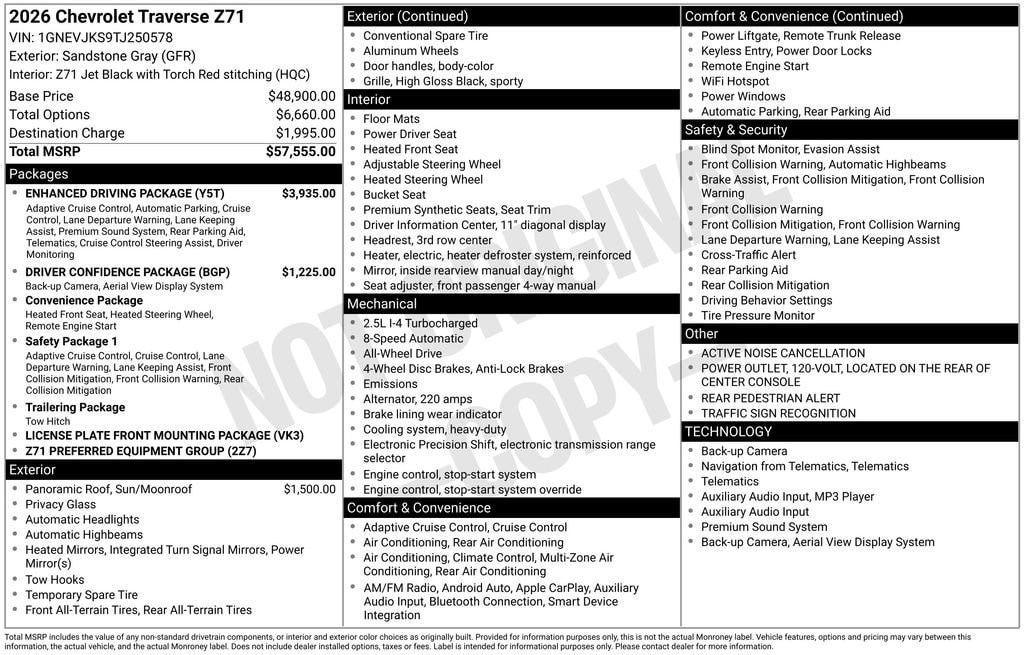 Experience the new Chevrolet Traverse, available now at Sky Chevrolet of Provo! With bold design, advanced technology, and dependable performance, Chevrolet makes every mile more exciting. From Utah Valleyâs city streets to mountain canyon drives, the Traverse is built to handle it all with confidence. Call 801-356-4300 today to schedule your test drive and see what makes it stand out! Sandstone Gray 2026 Chevrolet Traverse Z71 AWD 8-Speed Automatic 2.5L DOHC AWD. Price includes: $1,500 trade in allowance program for customers that own a 2018 or newer passenger car or truck with less than 80,000 miles and trade in their vehicle towards the purchase of a new 2025-2026 New Chevrolet. Some restrictions may apply. Contact dealer for details.