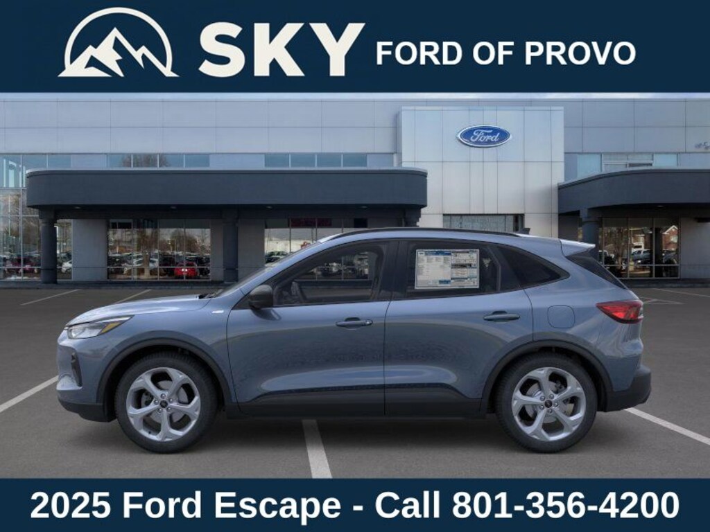 This 2025 Vapor Blue Metallic Ford Escape ST-Line AWD is well equipped and includes these features and benefits: AWD, 3.81 Axle Ratio, 4-Wheel Disc Brakes, 6 Speakers, ABS brakes, Air Conditioning, Alloy wheels, AM/FM radio: SiriusXM, AM/FM Stereo, Auto High-beam Headlights, Automatic temperature control, Brake assist, Bumpers: body-color, Compass, Delay-off headlights, Driver door bin, Driver vanity mirror, Dual front impact airbags, Dual front side impact airbags, Electronic Stability Control, Emergency communication system: SYNC 4 911 Assist, FordPass Connect, Four wheel independent suspension, Front anti-roll bar, Front Bucket Seats, Front Center Armrest, Front dual zone A/C, Front reading lights, Fully automatic headlights, Illuminated entry, Knee airbag, Low tire pressure warning, Occupant sensing airbag, Outside temperature display, Overhead airbag, Overhead console, Panic alarm, Passenger door bin, Passenger vanity mirror, Power door mirrors, Power driver seat, Power steering, Power windows, Radio data system, Rear anti-roll bar, Rear reading lights, Rear seat center armrest, Rear window defroster, Rear window wiper, Remote keyless entry, Speed control, Speed-sensing steering, Speed-Sensitive Wipers, Split folding rear seat, Spoiler, Sport steering wheel, Steering wheel mounted audio controls, SYNC 4, Tachometer, Telescoping steering wheel, Tilt steering wheel, Traction control, Trip computer, Variably intermittent wipers, Vinyl/Cloth Front Sport Contour Bucket Seats, and Wheels: 18" Rock Metallic Painted Aluminum.