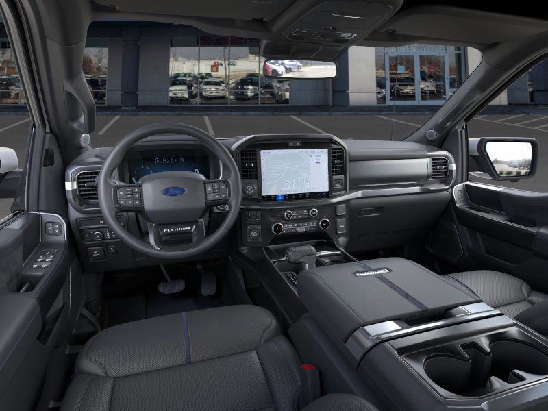This 2025 Space White Metallic Ford F-150 Platinum 4WD is well equipped and includes these features and benefits: 4WD, 4-Wheel Disc Brakes, 8 Speakers, ABS brakes, Adjustable pedals, Air Conditioning, Alloy wheels, AM/FM radio: SiriusXM with 360L, Auto High-beam Headlights, Auto tilt-away steering wheel, Auto-dimming door mirrors, Auto-dimming Rear-View mirror, Automatic temperature control, Brake assist, Bumpers: body-color, Compass, Delay-off headlights, Driver door bin, Driver vanity mirror, Dual front impact airbags, Dual front side impact airbags, Electronic Locking w/3.55 Axle Ratio, Electronic Stability Control, Emergency communication system: SYNC 4 911 Assist, Front anti-roll bar, Front Bucket Seats, Front Center Armrest, Front dual zone A/C, Front fog lights, Front reading lights, Front wheel independent suspension, Fully automatic headlights, Garage door transmitter, Heated door mirrors, Heated front seats, Heated rear seats, Heated steering wheel, Illuminated entry, Internet access capable: FordPass Connect 5G, Leather steering wheel, Low tire pressure warning, Memory seat, Navigation system: Connected Navigation, Occupant sensing airbag, Outside temperature display, Overhead airbag, Overhead console, Panic alarm, Passenger door bin, Passenger vanity mirror, Pedal memory, Power door mirrors, Power driver seat, Power passenger seat, Power steering, Power windows, Radio data system, Radio: B&O Sound System by Bang & Olufsen, Rain sensing wipers, Rear reading lights, Rear seat center armrest, Rear step bumper, Rear window defroster, Remote keyless entry, Security system, Speed control, Split folding rear seat, Steering wheel memory, Steering wheel mounted audio controls, SYNC 4 w/Enhanced Voice Recognition, Tachometer, Telescoping steering wheel, Tilt steering wheel, Traction control, Trip computer, Turn signal indicator mirrors, Unique Multi-Contour Leather Bucket Seats, Variably intermittent wipers, Ventilated front seats, Voltmeter, and Wheels: 20" Painted Gloss Ebony Black.