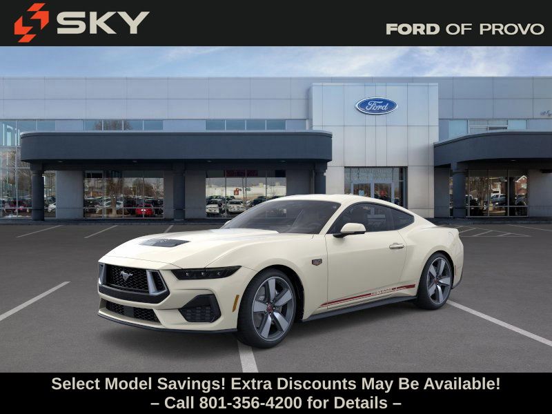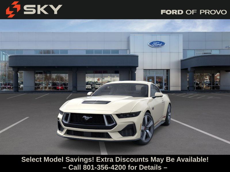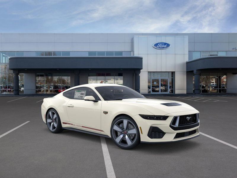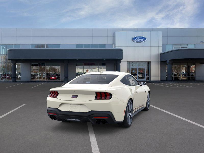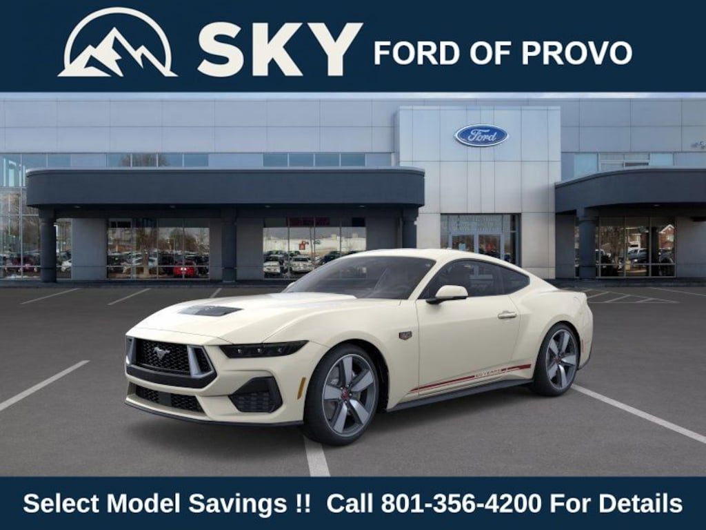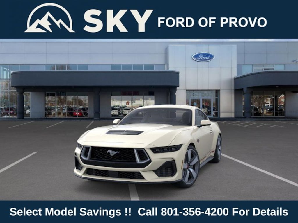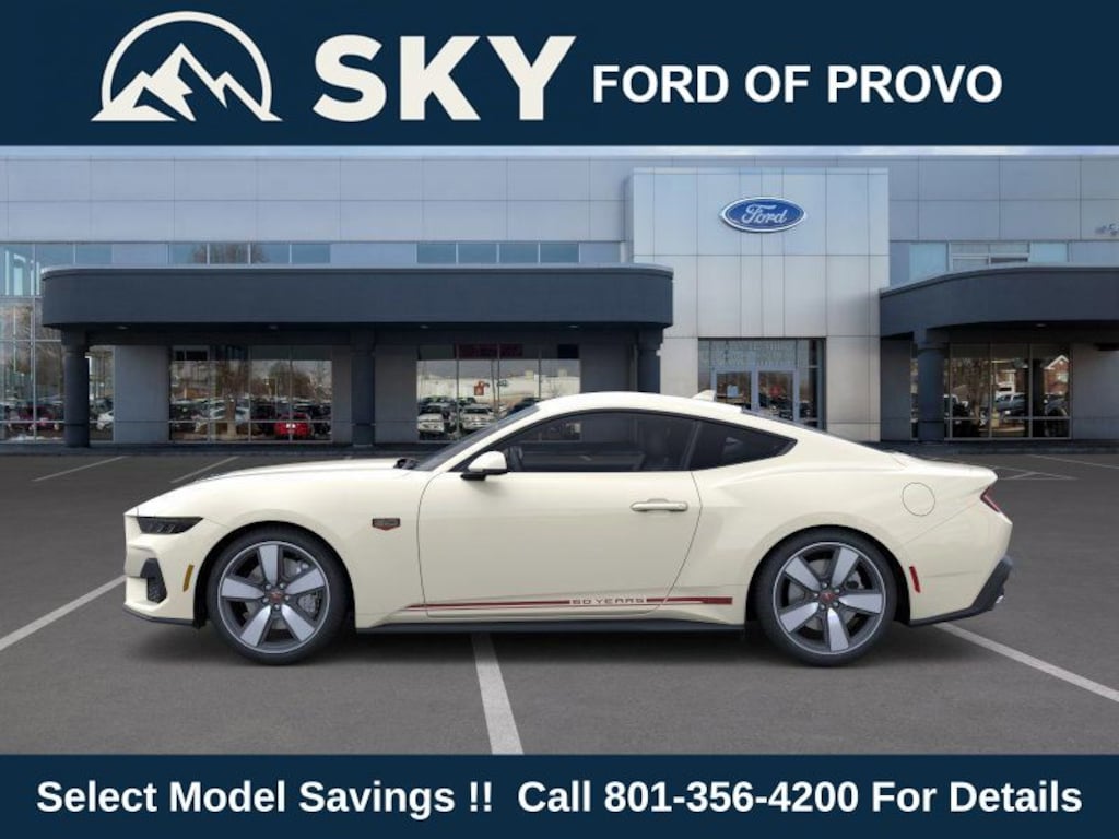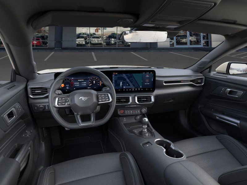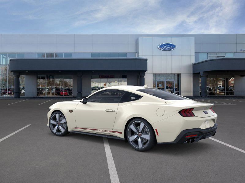 This 2025 Wimbledon White Ford Mustang GT Premium RWD is well equipped and includes these features and benefits: 60th Anniversary Package (20" Wheels, Anniversary Special Edition Badge, Headlamps w/Black Bezels, Painted High Gloss Black Honeycomb Grille, Silver Painted Mirror Caps, and Wheels: 20" x 9" Bright Machined Aluminum), Equipment Group 401A High Package (Driver Seat & Mirrors Memory, Illuminated Door-Sill Scuff Plates, Integrated Turn Signals, and Leather-Trimmed Bucket Seats w/Color Accents), Ford Co-Pilot360 Assist+ (Connected Navigation and Pre-Collision Assist w/Automatic Emergency Braking), Security Package (Active Anti-Theft System, Locking Center Console, and Wheel Locking Kit), Active Valve Performance Exhaust, B&O Sound System by Bang & Olufsen w/12 Speakers, Brembo Brake System, 3.55 Limited Slip Rear Axle, 4-Wheel Disc Brakes, ABS brakes, Air Conditioning, Alloy wheels, AM/FM Stereo, Auto High-beam Headlights, Automatic temperature control, Brake assist, Brembo Brake System w/Performance Linings, Bumpers: body-color, Compass, Delay-off headlights, Driver door bin, Driver vanity mirror, Dual front impact airbags, Dual front side impact airbags, Electronic Stability Control, Emergency communication system: 911 Assist, Exterior Parking Camera Rear, Four wheel independent suspension, Front anti-roll bar, Front Bucket Seats, Front Center Armrest, Front dual zone A/C, Front reading lights, Fully automatic headlights, Illuminated entry, Knee airbag, Leather Bucket Seats, Leather Shift Knob, Leather steering wheel, Low tire pressure warning, Occupant sensing airbag, Outside temperature display, Overhead airbag, Overhead console, Panic alarm, Passenger door bin, Passenger vanity mirror, Power door mirrors, Power steering, Power windows, Radio data system, Rain sensing wipers, Rear anti-roll bar, Rear Parking Sensors, Rear window defroster, Remote keyless entry, Speed control, Speed-sensing steering, Speed-Sensitive Wipers, Split folding rear seat, Spoiler, Sport steering wheel, Steering wheel mounted audio controls, SYNC 4, Tachometer, Telescoping steering wheel, Tilt steering wheel, Traction control, Trip computer, Variably intermittent wipers, and Voltmeter.