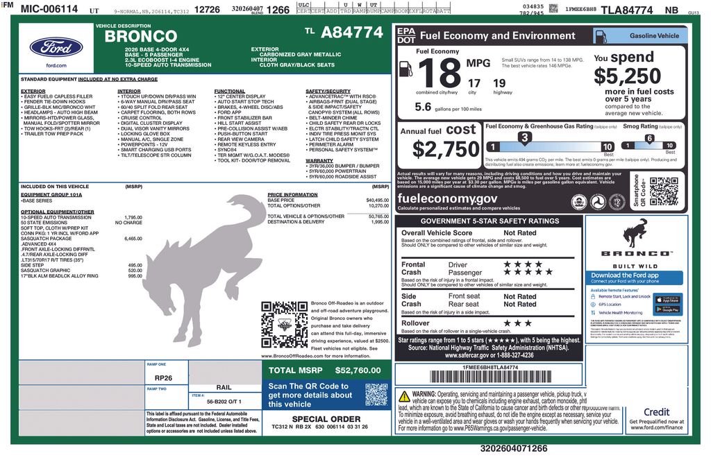 This 2026 Carbonized Gray Metallic Ford Bronco 4WD is well equipped and includes these features and benefits: Ford Connectivity Package (1-Year Included), 4-Wheel Disc Brakes, 4.46 Axle Ratio, 7 Speakers, ABS brakes, Air Conditioning, AM/FM radio: SiriusXM with 360L, AM/FM Stereo, Auto High-beam Headlights, Brake assist, Cloth Bucket Seats, Compass, Delay-off headlights, Driver door bin, Driver vanity mirror, Dual front impact airbags, Dual front side impact airbags, Electronic Stability Control, Emergency communication system: 911 Assist, Exterior Parking Camera Rear, Front anti-roll bar, Front Bucket Seats, Front Center Armrest, Front reading lights, Front wheel independent suspension, Fully automatic headlights, Heated door mirrors, Illuminated entry, Integrated roll-over protection, Low tire pressure warning, Occupant sensing airbag, Outside temperature display, Overhead airbag, Overhead console, Panic alarm, Passenger door bin, Passenger vanity mirror, Power door mirrors, Power steering, Power windows, Radio data system, Remote keyless entry, Security system, SiriusXM with 360L, Speed control, Split folding rear seat, Steering wheel mounted audio controls, SYNC 4, Tachometer, Telescoping steering wheel, Tilt steering wheel, Traction control, Trip computer, Variably intermittent wipers, and Wheels: 16" Bright Polished Silver-Painted Steel.