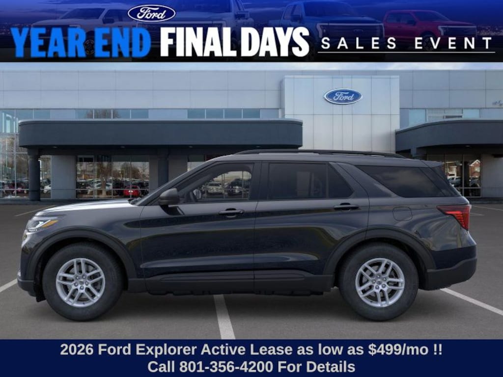 This 2026 Agate Black Metallic Ford Explorer Active 4WD is well equipped and includes these features and benefits: 4WD, 3rd row seats: bench, 4-Wheel Disc Brakes, 6 Speakers, ABS brakes, Air Conditioning, Alloy wheels, AM/FM radio: SiriusXM with 360L, AM/FM Stereo, Apple CarPlay/Android Auto, Auto High-beam Headlights, Automatic temperature control, Brake assist, Bumpers: body-color, Compass, Delay-off headlights, Driver door bin, Driver vanity mirror, Dual front impact airbags, Dual front side impact airbags, Electronic Stability Control, Emergency communication system: 911 Assist, Exterior Parking Camera Rear, Four wheel independent suspension, Front anti-roll bar, Front Bucket Seats, Front Center Armrest, Front dual zone A/C, Front reading lights, Fully automatic headlights, Heated door mirrors, Illuminated entry, Internet access capable: FordPass Connect 5G, Knee airbag, Low tire pressure warning, Navigation System, Occupant sensing airbag, Outside temperature display, Overhead airbag, Overhead console, Panic alarm, Passenger door bin, Passenger vanity mirror, Power driver seat, Power steering, Power windows, Rear air conditioning, Rear anti-roll bar, Rear reading lights, Rear window defroster, Rear window wiper, Remote keyless entry, Security system, Speed control, Speed-sensing steering, Speed-Sensitive Wipers, Split folding rear seat, Spoiler, Steering wheel mounted audio controls, Tachometer, Telescoping steering wheel, Tilt steering wheel, Traction control, Trip computer, Unique Cloth Captain's Chairs, Variably intermittent wipers, and Wheels: 18" Sparkle Silver-Painted Aluminum.