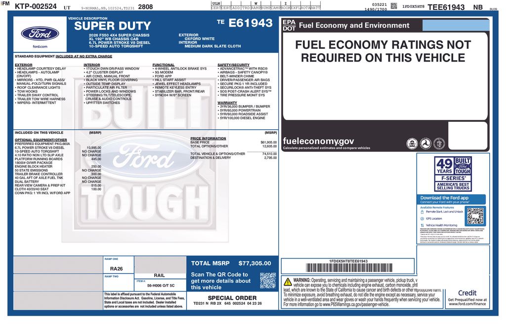 This 2026 Oxford White Ford F-550SD 4WD is well equipped and includes these features and benefits: Ford Connectivity Package (1-Year Included), GVWR: 18,000 lbs Payload Package, Internet access capable: 5G Modem - Ford Connectivity Package, 4WD, 4-Wheel Disc Brakes, 4.88 Axle Ratio, 6 Speakers, ABS brakes, Air Conditioning, AM/FM radio, Brake assist, Cloth 40/20/40 Split Bench Seat, Compass, Delay-off headlights, Dual front impact airbags, Dual front side impact airbags, Dual rear wheels, Emergency communication system: SYNC 4 911 Assist, Front anti-roll bar, Front Center Armrest w/Storage, Front reading lights, Fully automatic headlights, Heated door mirrors, Illuminated entry, Low tire pressure warning, Outside temperature display, Overhead airbag, Overhead console, Panic alarm, Passenger cancellable airbag, Passenger vanity mirror, Power door mirrors, Power steering, Power windows, Radio: AM/FM Stereo with MP3 Player, Rear anti-roll bar, Remote keyless entry, Security system, Speed control, Split folding rear seat, Steering wheel mounted audio controls, SYNC 4, Tachometer, Telescoping steering wheel, Tilt steering wheel, Traction control, Trip computer, Turn signal indicator mirrors, Variably intermittent wipers, and Wheels: 19.5" x 6" Argent Painted Steel.