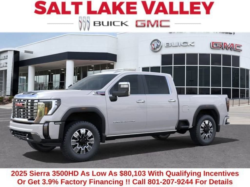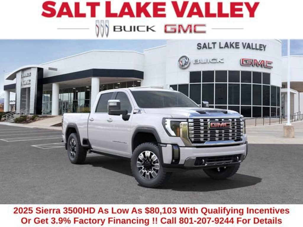 2025 GMC Sierra 3500HD Denali 4D Crew Cab White Frost Tricoat Duramax 6.6L V8 Turbodiesel 4WD --- Please note that the final selling price does not include tax, tag, title, documentation fees, dealer-installed options, or pricing adjustments due to market demand. Financing through GM Financial is required for all discounts to be applied. Special finance offers may not be combined with some factory incentives. While we strive for accuracy, errors may occur, so please verify all information with a customer service representative. For the most accurate pricing, call us at (801) 265-1511 or visit our dealership in person. Prices and payments are subject to change based on manufacturer incentives. ... Sale Price may include dealer discount, $1000 - Buick & GMC Consumer Cash Program $1000 - GM Bonus Cash - Price includes $1,500 trade in allowance program for customers that own a 2018 or newer passenger car or truck with less than 80,000 miles and trade in their vehicle towards the purchase of a new 2025-2026 Buick or GMC. Some restrictions may apply. Contact dealer for details - Price includes $2,000 Down Payment Assistance. Must Finance with GM Financial