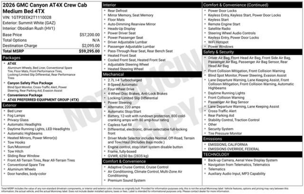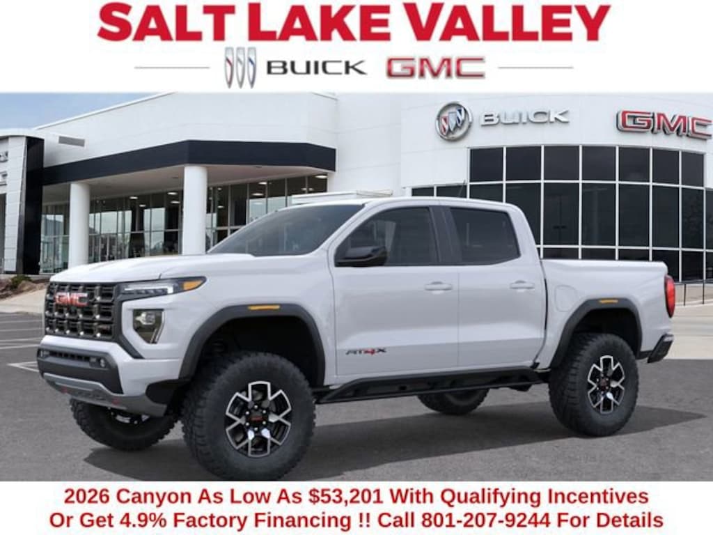 Take on every drive with confidence in the new GMC Canyon from Salt Lake Valley Buick GMC! Built for strength, style, and advanced capability, GMC delivers the perfect mix of power and precision. From city streets to Utah backroads, the Canyon is ready for anything. Contact us at 801-265-1511 today to schedule your test drive ! ---2026 GMC Canyon AT4X 4D Crew Cab Summit White 2.7L I4 Turbocharged DOHC 16V LEV3-SULEV30 310hp 4WD --- Please note that the final selling price does not include tax, tag, title, documentation fees, dealer-installed options, or pricing adjustments due to market demand. Financing through GM Financial is required for all discounts to be applied. Special finance offers may not be combined with some factory incentives. While we strive for accuracy, errors may occur, so please verify all information with a customer service representative. For the most accurate pricing, call us at (801) 265-1511 or visit our dealership in person. Prices and payments are subject to change based on manufacturer incentives. - Price includes $1,500 trade in allowance program for customers that own a 2018 or newer passenger car or truck with less than 80,000 miles and trade in their vehicle towards the purchase of a new 2025-2026 Buick or GMC. Some restrictions may apply. Contact dealer for details - Price includes $2,000 Down Payment Assistance. Must Finance with GM Financial