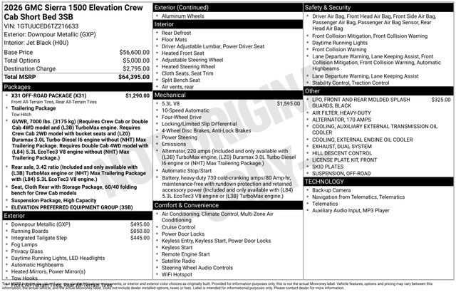 2026 GMC Sierra 1500 Elevation 4D Crew Cab Downpour Metallic EcoTec3 5.3L V8 4WD --- Please note that the final selling price does not include tax, tag, title, documentation fees, dealer-installed options, or pricing adjustments due to market demand. Financing through GM Financial is required for all discounts to be applied. Special finance offers may not be combined with some factory incentives. While we strive for accuracy, errors may occur, so please verify all information with a customer service representative. For the most accurate pricing, call us at (801) 265-1511 or visit our dealership in person. Prices and payments are subject to change based on manufacturer incentives. ... Sale Price may include dealer discount, $1500 - Buick GMC Bonus Cash $1750 - Buick & GMC Consumer Cash Program $3000 - GM Trade In Allowance Program
