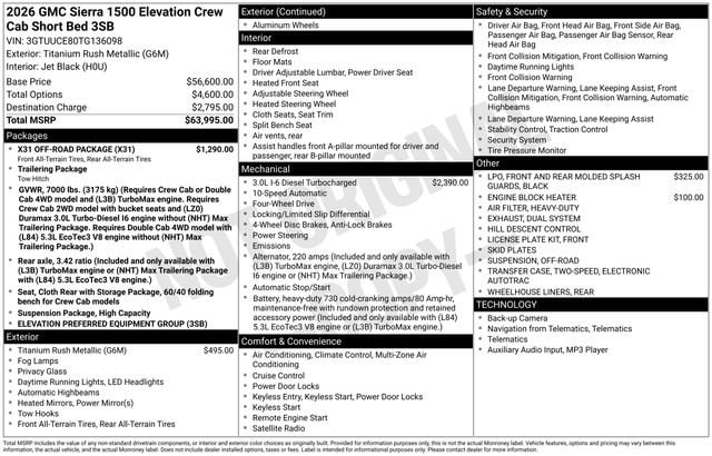 2026 GMC Sierra 1500 Elevation 4D Crew Cab Titanium Rush Metallic 3.0L I6 4WD 22/26 City/Highway MPG --- Please note that the final selling price does not include tax, tag, title, documentation fees, dealer-installed options, or pricing adjustments due to market demand. Financing through GM Financial is required for all discounts to be applied. Special finance offers may not be combined with some factory incentives. While we strive for accuracy, errors may occur, so please verify all information with a customer service representative. For the most accurate pricing, call us at (801) 265-1511 or visit our dealership in person. Prices and payments are subject to change based on manufacturer incentives. ... Sale Price may include dealer discount, $1750 - Buick & GMC Consumer Cash Program $2500 - GM Trade In Allowance Program $500 - Buick GMC Bonus Cash - Price includes $2,000 Down Payment Assistance. Must Finance with GM Financial