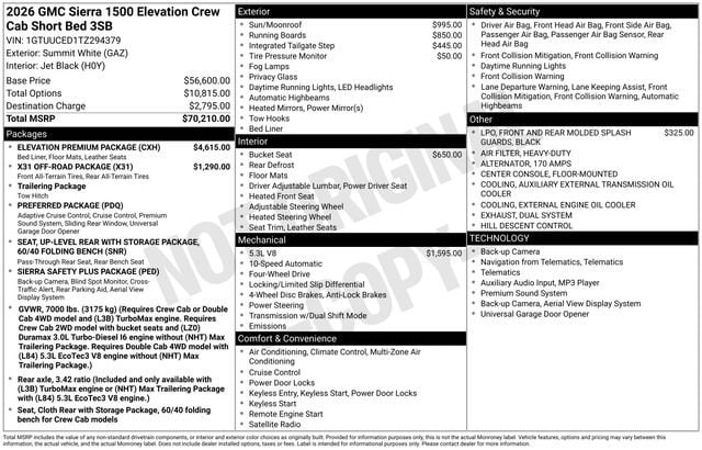 2026 GMC Sierra 1500 Elevation 4D Crew Cab Summit White EcoTec3 5.3L V8 4WD --- Please note that the final selling price does not include tax, tag, title, documentation fees, dealer-installed options, or pricing adjustments due to market demand. Financing through GM Financial is required for all discounts to be applied. Special finance offers may not be combined with some factory incentives. While we strive for accuracy, errors may occur, so please verify all information with a customer service representative. For the most accurate pricing, call us at (801) 265-1511 or visit our dealership in person. Prices and payments are subject to change based on manufacturer incentives. ... Sale Price may include dealer discount, $1500 - Buick GMC Bonus Cash $1750 - Buick & GMC Consumer Cash Program