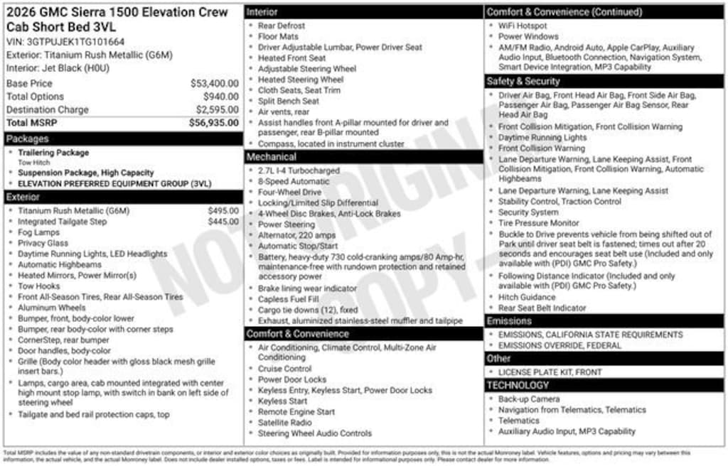 2026 GMC Sierra 1500 Elevation 4D Crew Cab Titanium Rush Metallic 2.7L I4 Turbocharged DOHC 16V LEV3-SULEV30 310hp 4WD --- Please note that the final selling price does not include tax, tag, title, documentation fees, dealer-installed options, or pricing adjustments due to market demand. Financing through GM Financial is required for all discounts to be applied. Special finance offers may not be combined with some factory incentives. While we strive for accuracy, errors may occur, so please verify all information with a customer service representative. For the most accurate pricing, call us at (801) 265-1511 or visit our dealership in person. Prices and payments are subject to change based on manufacturer incentives. ... Sale Price may include dealer discount, $1500 - Buick & GMC Consumer Cash Program $1750 - GM Bonus Cash $250 - December GMC Sales Event LD Bonus Cash - Price includes $1,500 trade in allowance program for customers that own a 2018 or newer passenger car or truck with less than 80,000 miles and trade in their vehicle towards the purchase of a new 2025-2026 Buick or GMC. Some restrictions may apply. Contact dealer for details - Price includes $2,000 Down Payment Assistance. Must Finance with GM Financial