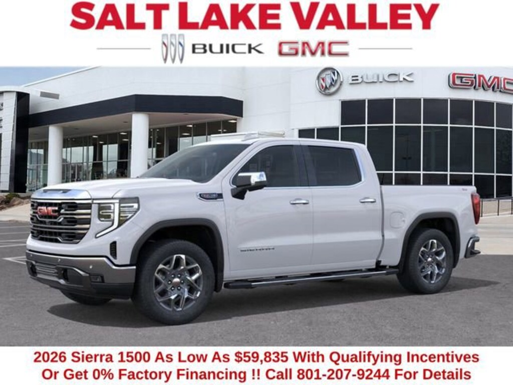 2026 GMC Sierra 1500 SLT 4D Crew Cab Summit White EcoTec3 6.2L V8 4WD --- Please note that the final selling price does not include tax, tag, title, documentation fees, dealer-installed options, or pricing adjustments due to market demand. Financing through GM Financial is required for all discounts to be applied. Special finance offers may not be combined with some factory incentives. While we strive for accuracy, errors may occur, so please verify all information with a customer service representative. For the most accurate pricing, call us at (801) 265-1511 or visit our dealership in person. Prices and payments are subject to change based on manufacturer incentives. ... Sale Price may include dealer discount, $1500 - Buick & GMC Consumer Cash Program $250 - December GMC Sales Event LD Bonus Cash $500 - GM Bonus Cash - Price includes $1,500 trade in allowance program for customers that own a 2018 or newer passenger car or truck with less than 80,000 miles and trade in their vehicle towards the purchase of a new 2025-2026 Buick or GMC. Some restrictions may apply. Contact dealer for details - Price includes $2,000 Down Payment Assistance. Must Finance with GM Financial