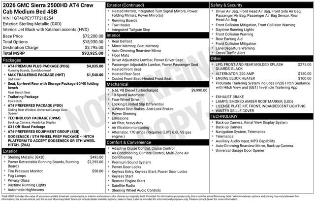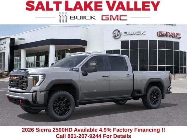 2026 GMC Sierra 2500HD AT4 4D Crew Cab Sterling Metallic Duramax 6.6L V8 Turbodiesel 4WD --- Please note that the final selling price does not include tax, tag, title, documentation fees, dealer-installed options, or pricing adjustments due to market demand. Financing through GM Financial is required for all discounts to be applied. Special finance offers may not be combined with some factory incentives. While we strive for accuracy, errors may occur, so please verify all information with a customer service representative. For the most accurate pricing, call us at (801) 265-1511 or visit our dealership in person. Prices and payments are subject to change based on manufacturer incentives. ... Sale Price may include dealer discount, $1000 - Buick & GMC Consumer Cash Program