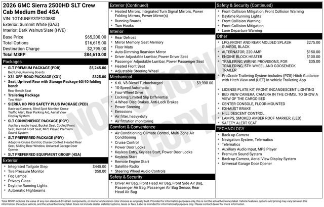 2026 GMC Sierra 2500HD SLT 4D Crew Cab Summit White Duramax 6.6L V8 Turbodiesel 4WD --- Please note that the final selling price does not include tax, tag, title, documentation fees, dealer-installed options, or pricing adjustments due to market demand. Financing through GM Financial is required for all discounts to be applied. Special finance offers may not be combined with some factory incentives. While we strive for accuracy, errors may occur, so please verify all information with a customer service representative. For the most accurate pricing, call us at (801) 265-1511 or visit our dealership in person. Prices and payments are subject to change based on manufacturer incentives. ... Sale Price may include dealer discount, $500 - Buick & GMC Consumer Cash Program - Price includes $2,000 Down Payment Assistance. Must Finance with GM Financial - Price includes $1,500 trade in allowance program for customers that own a 2019 or newer passenger car or truck with less than 80,000 miles and trade in their vehicle towards the purchase of a new 2025-2026 Buick or GMC. Some restrictions may apply. Contact dealer for details