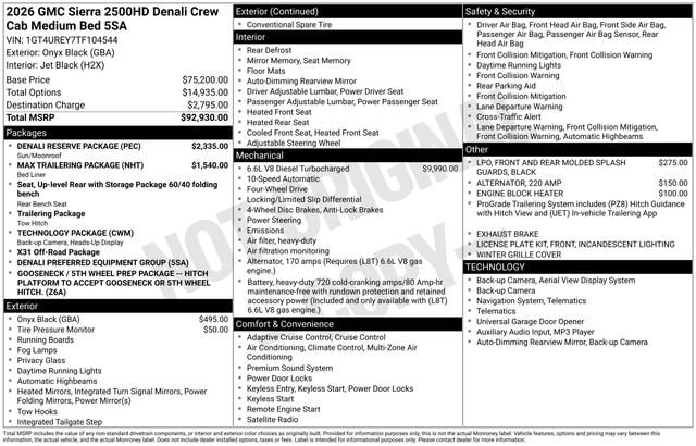 2026 GMC Sierra 2500HD Denali 4D Crew Cab Onyx Black Duramax 6.6L V8 Turbodiesel 4WD --- Please note that the final selling price does not include tax, tag, title, documentation fees, dealer-installed options, or pricing adjustments due to market demand. Financing through GM Financial is required for all discounts to be applied. Special finance offers may not be combined with some factory incentives. While we strive for accuracy, errors may occur, so please verify all information with a customer service representative. For the most accurate pricing, call us at (801) 265-1511 or visit our dealership in person. Prices and payments are subject to change based on manufacturer incentives. ... Sale Price may include dealer discount, $500 - Buick & GMC Consumer Cash Program - Price includes $2,000 Down Payment Assistance. Must Finance with GM Financial - Price includes $1,500 trade in allowance program for customers that own a 2019 or newer passenger car or truck with less than 80,000 miles and trade in their vehicle towards the purchase of a new 2025-2026 Buick or GMC. Some restrictions may apply. Contact dealer for details