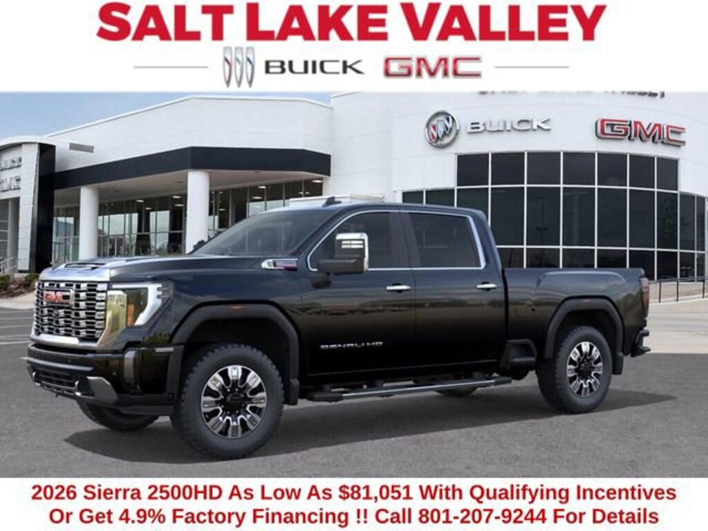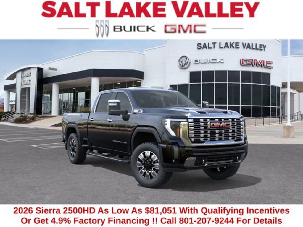 2026 GMC Sierra 2500HD Denali 4D Crew Cab Onyx Black Duramax 6.6L V8 Turbodiesel 4WD --- Please note that the final selling price does not include tax, tag, title, documentation fees, dealer-installed options, or pricing adjustments due to market demand. Financing through GM Financial is required for all discounts to be applied. Special finance offers may not be combined with some factory incentives. While we strive for accuracy, errors may occur, so please verify all information with a customer service representative. For the most accurate pricing, call us at (801) 265-1511 or visit our dealership in person. Prices and payments are subject to change based on manufacturer incentives. ... Sale Price may include dealer discount, $500 - Buick & GMC Consumer Cash Program - Price includes $1,500 trade in allowance program for customers that own a 2018 or newer passenger car or truck with less than 80,000 miles and trade in their vehicle towards the purchase of a new 2025-2026 Buick or GMC. Some restrictions may apply. Contact dealer for details - Price includes $2,000 Down Payment Assistance. Must Finance with GM Financial