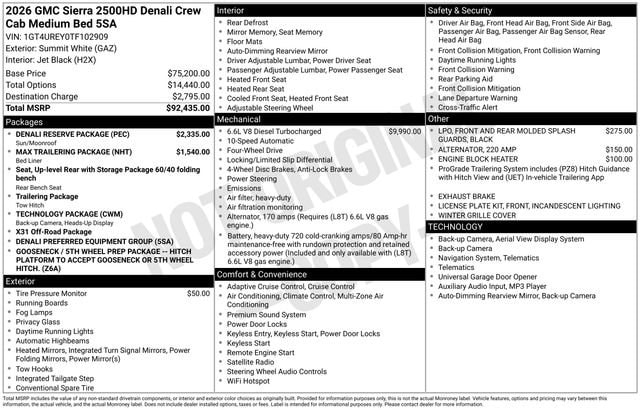 2026 GMC Sierra 2500HD Denali 4D Crew Cab Summit White Duramax 6.6L V8 Turbodiesel 4WD --- Please note that the final selling price does not include tax, tag, title, documentation fees, dealer-installed options, or pricing adjustments due to market demand. Financing through GM Financial is required for all discounts to be applied. Special finance offers may not be combined with some factory incentives. While we strive for accuracy, errors may occur, so please verify all information with a customer service representative. For the most accurate pricing, call us at (801) 265-1511 or visit our dealership in person. Prices and payments are subject to change based on manufacturer incentives. ... Sale Price may include dealer discount, $500 - Buick & GMC Consumer Cash Program - Price includes $2,000 Down Payment Assistance. Must Finance with GM Financial - Price includes $1,500 trade in allowance program for customers that own a 2019 or newer passenger car or truck with less than 80,000 miles and trade in their vehicle towards the purchase of a new 2025-2026 Buick or GMC. Some restrictions may apply. Contact dealer for details