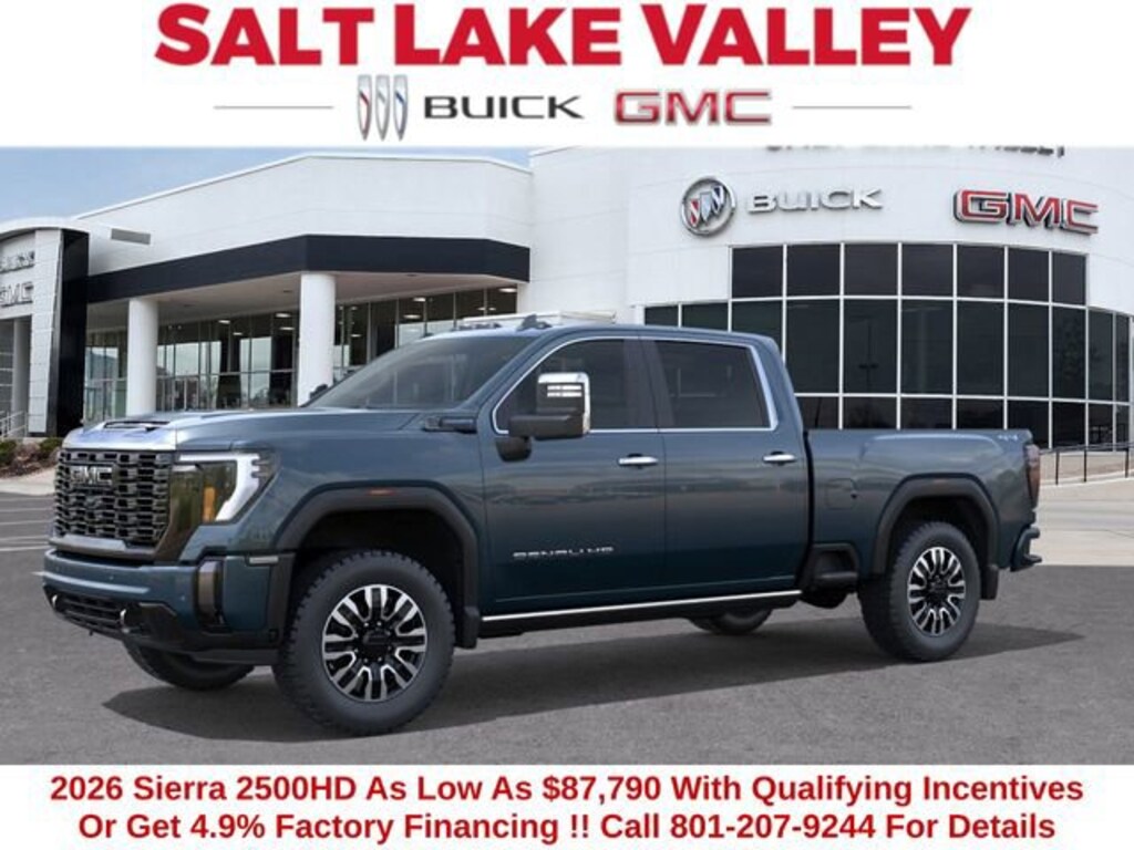 2026 GMC Sierra 2500HD Denali Ultimate 4D Crew Cab Downpour Metallic Duramax 6.6L V8 Turbodiesel 4WD --- Please note that the final selling price does not include tax, tag, title, documentation fees, dealer-installed options, or pricing adjustments due to market demand. Financing through GM Financial is required for all discounts to be applied. Special finance offers may not be combined with some factory incentives. While we strive for accuracy, errors may occur, so please verify all information with a customer service representative. For the most accurate pricing, call us at (801) 265-1511 or visit our dealership in person. Prices and payments are subject to change based on manufacturer incentives. ... Sale Price may include dealer discount, $500 - Buick & GMC Consumer Cash Program - Price includes $1,500 trade in allowance program for customers that own a 2018 or newer passenger car or truck with less than 80,000 miles and trade in their vehicle towards the purchase of a new 2025-2026 Buick or GMC. Some restrictions may apply. Contact dealer for details - Price includes $2,000 Down Payment Assistance. Must Finance with GM Financial