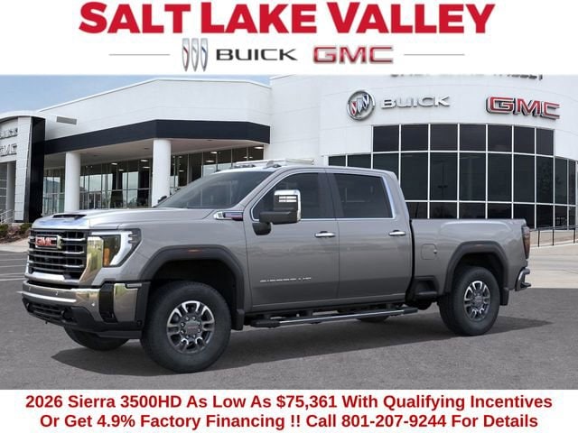 2026 GMC Sierra 3500HD SLT 4D Crew Cab Sterling Metallic Duramax 6.6L V8 Turbodiesel 4WD --- Please note that the final selling price does not include tax, tag, title, documentation fees, dealer-installed options, or pricing adjustments due to market demand. Financing through GM Financial is required for all discounts to be applied. Special finance offers may not be combined with some factory incentives. While we strive for accuracy, errors may occur, so please verify all information with a customer service representative. For the most accurate pricing, call us at (801) 265-1511 or visit our dealership in person. Prices and payments are subject to change based on manufacturer incentives. ... Sale Price may include dealer discount, $500 - Buick & GMC Consumer Cash Program $500 - Buick GMC Bonus Cash - Price includes $2,000 Down Payment Assistance. Must Finance with GM Financial Price includes $1,500 Trade-In Allowance for customers trading a 2019 or newer passenger car or truck with under 80,000 miles toward a new 2025 2026 Buick or GMC. Branded or salvage title vehicles do not qualify. Some restrictions apply. See dealer for details.