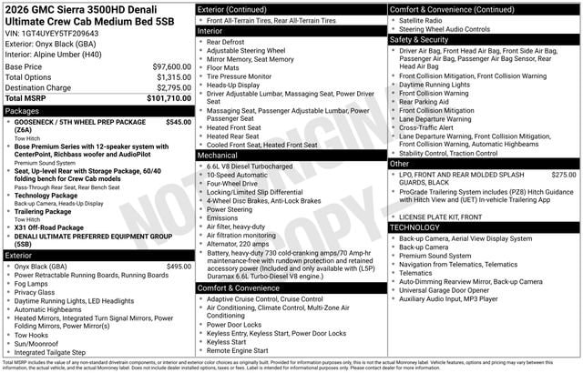 2026 GMC Sierra 3500HD Denali Ultimate 4D Crew Cab Onyx Black Duramax 6.6L V8 Turbodiesel 4WD --- Please note that the final selling price does not include tax, tag, title, documentation fees, dealer-installed options, or pricing adjustments due to market demand. Financing through GM Financial is required for all discounts to be applied. Special finance offers may not be combined with some factory incentives. While we strive for accuracy, errors may occur, so please verify all information with a customer service representative. For the most accurate pricing, call us at (801) 265-1511 or visit our dealership in person. Prices and payments are subject to change based on manufacturer incentives. ... Sale Price may include dealer discount, $1000 - Buick & GMC Consumer Cash Program