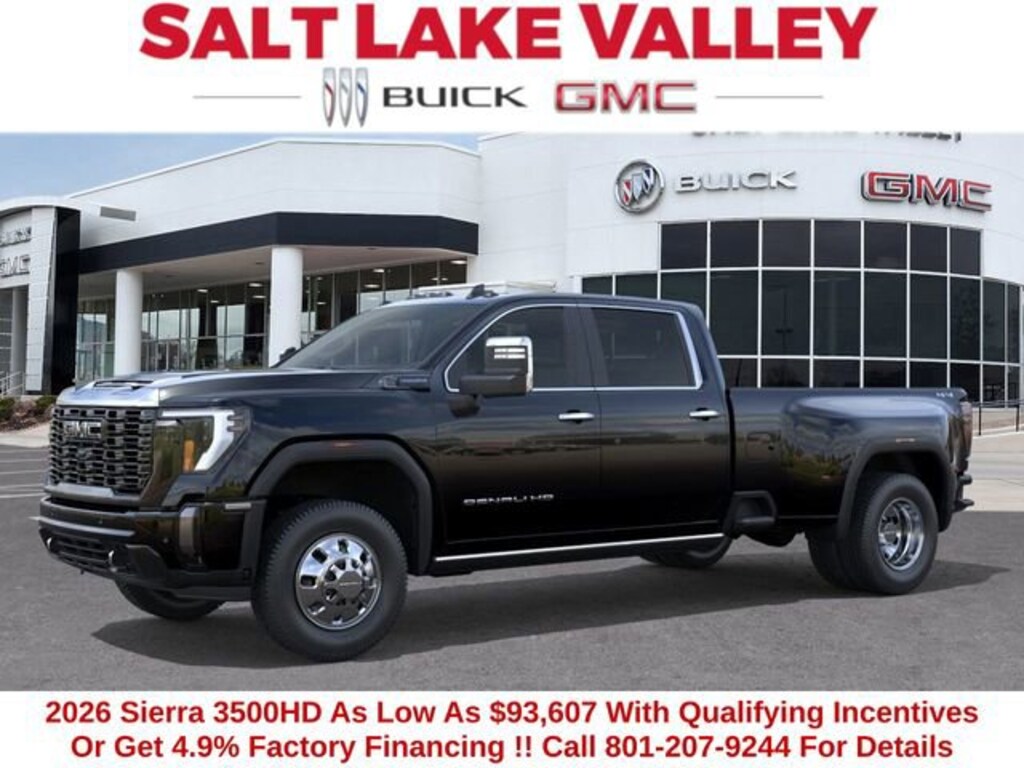 2026 GMC Sierra 3500HD Denali Ultimate 4D Crew Cab Onyx Black Duramax 6.6L V8 Turbodiesel 4WD --- Please note that the final selling price does not include tax, tag, title, documentation fees, dealer-installed options, or pricing adjustments due to market demand. Financing through GM Financial is required for all discounts to be applied. Special finance offers may not be combined with some factory incentives. While we strive for accuracy, errors may occur, so please verify all information with a customer service representative. For the most accurate pricing, call us at (801) 265-1511 or visit our dealership in person. Prices and payments are subject to change based on manufacturer incentives. ... Sale Price may include dealer discount, $500 - Buick & GMC Consumer Cash Program - Price includes $1,500 trade in allowance program for customers that own a 2018 or newer passenger car or truck with less than 80,000 miles and trade in their vehicle towards the purchase of a new 2025-2026 Buick or GMC. Some restrictions may apply. Contact dealer for details - Price includes $2,000 Down Payment Assistance. Must Finance with GM Financial