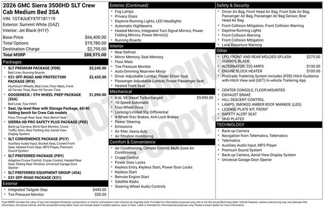 2026 GMC Sierra 3500HD SLT 4D Crew Cab Summit White Duramax 6.6L V8 Turbodiesel 4WD --- Please note that the final selling price does not include tax, tag, title, documentation fees, dealer-installed options, or pricing adjustments due to market demand. Financing through GM Financial is required for all discounts to be applied. Special finance offers may not be combined with some factory incentives. While we strive for accuracy, errors may occur, so please verify all information with a customer service representative. For the most accurate pricing, call us at (801) 265-1511 or visit our dealership in person. Prices and payments are subject to change based on manufacturer incentives. ... Sale Price may include dealer discount, $1000 - Buick & GMC Consumer Cash Program