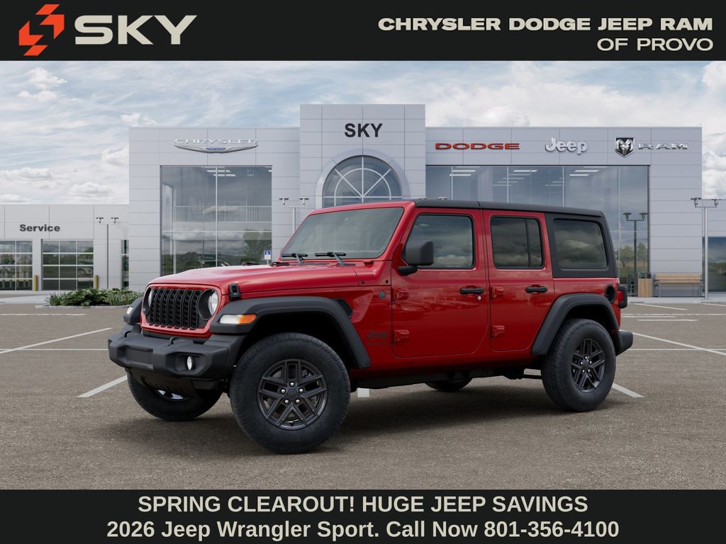 Adventure starts here with the new Jeep Wrangler, available now at Sky CDJR of Provo! As your local Jeep dealership near Salt Lake City, we know how to match Utah drivers with legendary 4x4 capability and open-road freedom. Whether itâs mountain trails or desert drives, the Wrangler is ready to take you there. Call 801-356-4100 today to start your next adventure! Firecracker Red Clearcoat 2026 Jeep Wrangler Sport 4WD 8-Speed Automatic 2.0L I4 DOHC