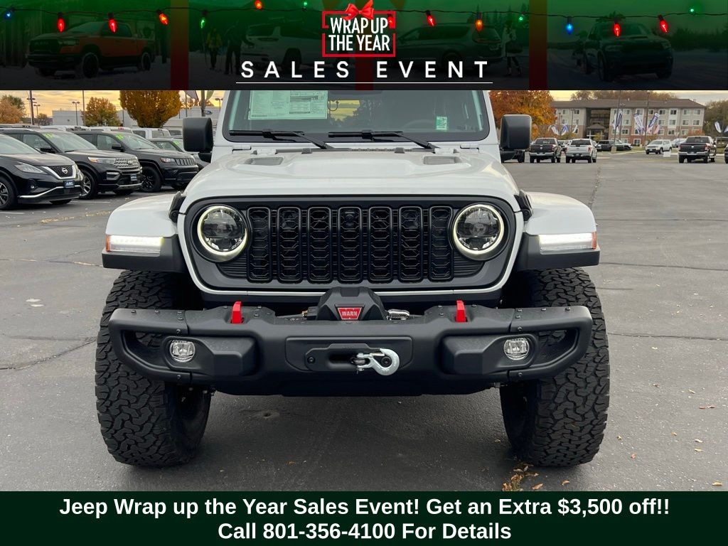 Quick Order Package 24Y Rubicon X (12.3" Touchscreen Display, 4G LTE Wi-Fi Hot Spot, Acoustic Front Seat Area Carpet, Acoustic Laminated Front Door Glass, Alpine Premium Audio System, Apple CarPlay, Auto High Beam Headlamp Control, Auto-Dimming Rear-View Mirror, Blind Spot and Cross Path Detection, Body Color 3-Piece Hard Top, Body Color Rubicon Highline Flare, Connected Travel and Traffic Services, Connectivity - US/Canada, Freedom Panel Storage Bag, Google Android Auto, HD Radio, Heated Front Seats, Heated Steering Wheel, Integrated Off-Road Camera, Integrated Voice Command with Bluetooth, Leather Wrapped Park Brake Handle, Leather Wrapped Shift Knob, MOPAR Hardtop Headliner, Nappa Leather Seats, ParkSense Rear Park Assist System, Power 4-Way Driver Lumbar Adjust, Power 4-Way Passenger Lumbar Adjust, Power Adjust 8-Way Driver Seat, Power Adjust 8-Way Front Passenger Seat, Premium Door Trim Panel, Radio: Uconnect 5 Navigation with 12.3" Display, Rear Window Defroster, Rear Window Wiper/Washer, SiriusXM with 360L, Steel Front Bumper, Steel Rear Bumper, and Universal Garage Door Opener), Trailer Tow and Auxiliary Switch Group (Auxiliary Switches and Class II Receiver Hitch), Trailer Tow Prep Package, 35" Tire Suspension, 4-Wheel Disc Brakes, 8 Speakers, ABS brakes, Air Conditioning, Alloy wheels, AM/FM radio: SiriusXM with 360L, Apple CarPlay/Android Auto, Automatic temperature control, Aux Battery, Brake assist, Cloth Low-Back Bucket Seats, Compass, Delay-off headlights, Driver door bin, Driver vanity mirror, Dual front impact airbags, Dual front side impact airbags, Electronic Stability Control, Emergency communication system: Jeep Connect, For More Info, Call 800-643-2112, Front anti-roll bar, Front Bucket Seats, Front Center Armrest w/Storage, Front dual zone A/C, Front fog lights, Front License Plate Bracket, Front reading lights, Fully automatic headlights, Heated door mirrors, Illuminated entry, Integrated Center Stack Radio, Integrated roll-over protection, Low tire pressure warning, MOPAR All-Weather Floor Mats, MOPAR Hinge-Gate Reinforcement, MOPAR Performance Satin Black Grille, Non-Lock Fuel Cap Without Discriminator, Occupant sensing airbag, Outside temperature display, Overhead airbag, Panic alarm, ParkView Rear Back-Up Camera, Passenger door bin, Passenger vanity mirror, Performance Suspension, Power door mirrors, Power steering, Power windows, Radio data system, Radio: Uconnect 5 with 12.3" Display, Rear anti-roll bar, Rear reading lights, Remote keyless entry, Security system, SiriusXM Radio Service, Speed control, Split folding rear seat, Steering wheel mounted audio controls, Stop-Start Dual Battery System, Tachometer, Telescoping steering wheel, Tilt steering wheel, Traction control, Trip computer, Variably intermittent wipers, Voltmeter, Warn Winch, Wheels: 17" x 7.5" Machined/Painted Black, and Wheels: 17" x 8" Machined with Black Pockets. $1,500 trade in allowance program for customers that own a 2018 or newer passenger car or truck with less than 80,000 miles and trade in their vehicle towards the purchase of a new vehicle. Some restrictions may apply. Contact dealer for details. $1,500 Down Payment Assistance. Must Finance with CCAP. May not be combined with some factory incentives. Contact dealer for details.