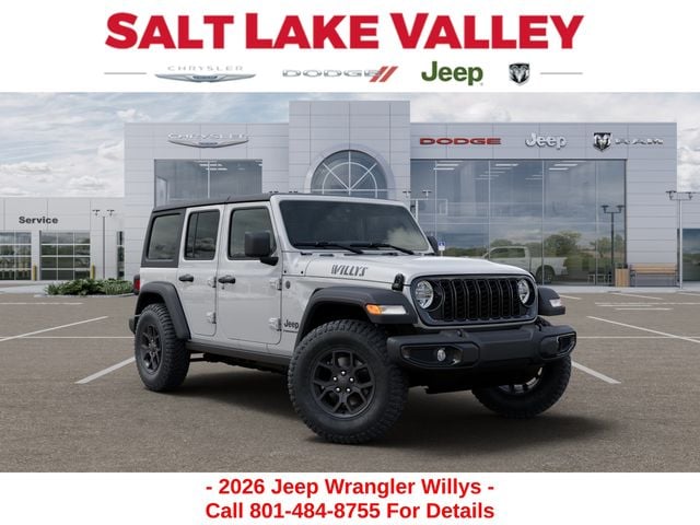 Adventure starts with the new Jeep Wrangler available now at Salt Lake Valley CDJR in Salt Lake City! Built for Utahâs canyons, trails, and highways alike, Jeep delivers freedom and capability in every mile. Discover why Wrangler drivers love to explore with confidence. Contact us at 801-484-8755 to schedule a time to see it today! 2026 Jeep Wrangler Willys Bright White Clearcoat 3.6L V6 24V VVT