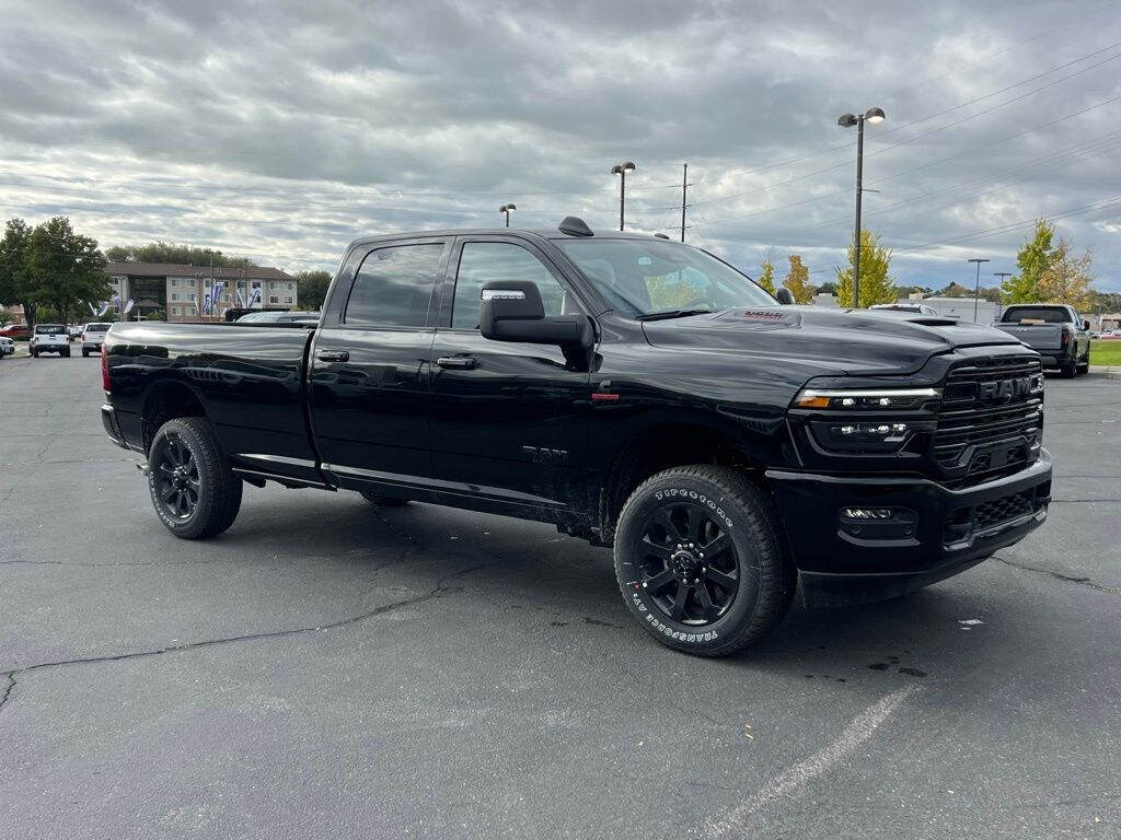 Laramie Level 1 Plus Equipment Group (#1 Seat Foam Cushion, 115V Auxiliary Rear Power Outlet, 2 Way Rear Headrest Seat, 2nd Row In Floor Storage Bins, 4 Way Front Headrests, Active Lane Management System, Adaptive Steering System, Auto Adjust In Reverse Exterior Mirrors, Auto Dimming Exterior Passenger Mirror, Auto High Beam Headlamp Control, Auto Power-Folding Mirrors, Auto-Dimming Exterior Mirrors, Bucket Seats, Chrome Exterior Mirrors, CTR Stop Lamp w/Cargo View Camera, Drowsy Driver Detection, Dual Wireless Charging Pad, Exterior Mirrors Courtesy Lamps, Exterior Mirrors w/Heating Element, Exterior Mirrors w/Memory, Exterior Mirrors w/Supplemental Signals, Foam Bottle Insert (Door Trim Panel), Folding Flat Load Floor Storage, Forward & Reverse Utility Lights, Front Seat Back Map Pockets, Full Length Upgraded Floor Console, Heated Front Seats, Heated Steering Wheel, High Back Seats, Leather Trimmed Bucket Seats, LED Bed Lighting, Mirror Running Lights, MOPAR Deployable Bed Step, MOPAR Spray In Bedliner, Power 2-Way Driver Lumbar Adjust, Power 2-Way Passenger Lumbar Adjust, Power Adjust 8-Way Driver Seat, Power Adjust 8-Way Front Passenger Seat, Power Adjust Mirrors, Power Adjustable Pedals w/Memory, Power Heat Fold Memory Telescopic Mirrors, Power Telescoping Mirrors, Power-Adjustable Convex Aux Mirrors, Rain Sensitive Windshield Wipers, Rear 60/40 Folding Seat, Remote Tailgate Release, and Traffic Sign Recognition), Night Edition (Black Exterior Mirrors, Black Exterior Truck Badging, Black Wheel Center Hub, Body Color Grille Surround, Gloss Black Grille Billets/Accents, and Sport Performance Hood), Quick Order Package 24H Laramie, 10 Speakers, 4-Wheel Disc Brakes, 4G LTE Wi-Fi Hot Spot, 50 Gallon Fuel Tank, ABS brakes, Air Conditioning, Alexa Built-In, Alloy wheels, AM/FM radio: SiriusXM with 360L, Apple CarPlay, Apple CarPlay/Android Auto, Auto-dimming Rear-View mirror, Automatic temperature control, Brake assist, Bumpers: body-color, Compass, Connected Travel & Traffic Services, Connectivity - US/Canada, Delay-off headlights, Disassociated Touchscreen Display, Driver door bin, Driver vanity mirror, Dual front impact airbags, Dual front side impact airbags, Electronic Stability Control, Emergency Vehicle Alert System (EVAS), Front anti-roll bar, Front Center Armrest w/Storage, Front dual zone A/C, Front fog lights, Front License Plate Bracket, Front reading lights, Fully automatic headlights, Garage door transmitter, Global Telematics Box Module (TBM), Google Android Auto, GPS Antenna Input, GPS Navigation, HD Radio, Heated door mirrors, Heated front seats, Heated steering wheel, Illuminated entry, Integrated Voice Command w/Bluetooth, Leather Trim 40/20/40 Bench Seat, Low tire pressure warning, MOPAR Front & Rear Rubber Floor Mats, Navigation System, Occupant sensing airbag, Off-Road Information Pages, Outside temperature display, Overhead airbag, Overhead console, Panic alarm, ParkView Rear Back-Up Camera, Passenger door bin, Passenger vanity mirror, Power door mirrors, Power driver seat, Power passenger seat, Powe Price may include: $1000 - 2026 National Bonus Cash . Exp. 11/03/2025 $1,500 trade in allowance program for customers that own a 2018 or newer passenger car or truck with less than 80,000 miles and trade in their vehicle towards the purchase of a new vehicle. Some restrictions may apply. Contact dealer for details. $1,000 Down Payment Assistance. Must Finance with CCAP. May not be combined with some factory incentives. Contact dealer for d