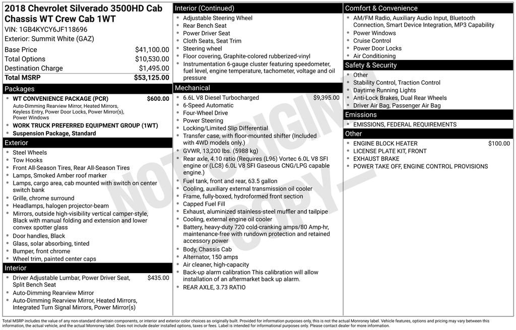 Summit White 2018 Chevrolet Silverado 3500HD Work Truck 4WD Allison 1000 6-Speed Automatic Duramax 6.6L V8 Turbodiesel Allison 1000 6-Speed Automatic, 4WD, Black Cloth.