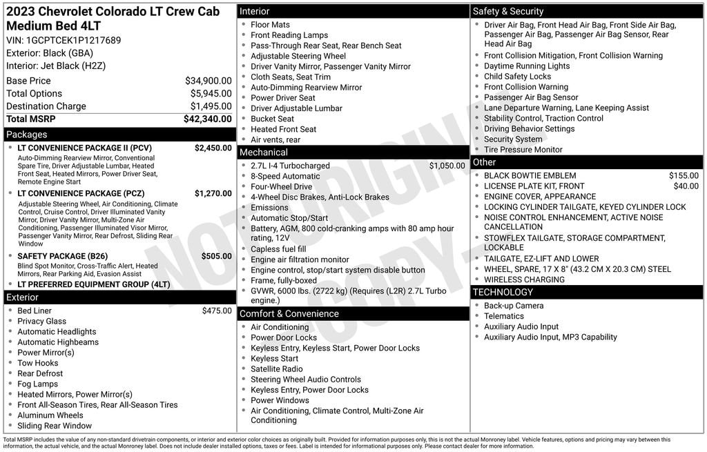 Black 2023 Chevrolet Colorado LT 4WD 8-Speed Automatic 2.7L Turbo 4WD.Recent Arrival!Check out our 5 Star Google Reviews! Drive a little save a lot. Sale Price Includes $1,000 Finance Savings. Contact Dealer For Details.