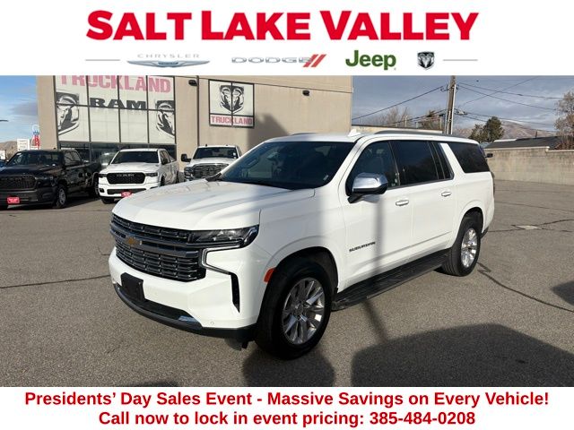 Get ready to hit the road in this Chevrolet Suburban, a standout choice for drivers looking for reliability, performance, and style! This impressive vehicle is packed with premium features designed to make every drive more enjoyable. Plus, youâll enjoy a $1,000 finance savings, already included in the sale price, when you finance through one of our trusted lending partners. Whether youâre searching for used cars in Salt Lake City, a dependable SUV, or a powerful truck, this Chevrolet Suburban delivers everything you need and more. Visit Salt Lake Valley Chrysler Dodge Jeep Ram today to test drive or explore our entire selection of quality pre-owned vehicles. Donât wait - shop online at www.slvcdjr.com or call 801-484-8755 to learn more! This amazing vehicle comes loaded with options like License Plate Front Mounting Package, Preferred Equipment Group 1LZ (1st & 2nd Row Color-Keyed Carpeted Floor Mats, 2-Speed Active Electronic AutoTrac Transfer Case, 3rd Row 60/40 Power-Folding Split-Bench, Auto-Dimming Inside Rear-View Mirror, Bose 10-Speaker Surround w/CenterPoint, Bright Front & Rear Door Sill Plates, Chrome Door Handles w/Body-Color Strip, Chrome Mirror Caps, Color-Keyed Carpeting Floor Covering, Driver & Front Outboard Passenger Airbags, Dual Exhaust System, Enhanced Driver Information Center, Floor Console, Hands-Free Rear Power Programmable Liftgate, Heated & Ventilated Driver & Front Passenger Seats, Heated 2nd Row Outboard Seats, Heated Driver & Front Passenger Seats, Heated Steering Wheel, Hill Descent Control, Infotainment Display, Lane Change Alert w/Side Blind Zone Alert, LED Daytime Running Lamps, Memory Settings, Outside Heated Power-Adjustable Mirrors, Power Release 2nd Row Bucket Seats, Power Tilt & Telescopic Steering Column, Rear Cross Traffic Alert, Remote Start, Safety Alert Seat, SiriusXM Radio w/360L, Universal Home Remote, Wireless Charging, and Wrapped Steering Wheel), 10 Speakers, 20" x 9" Polished Aluminum Wheels, 3.23 Rear Axle Ratio, 3rd row seats: split-bench, 4-Wheel Disc Brakes, ABS brakes, Adaptive suspension, Air Conditioning, Alloy wheels, AM/FM radio: SiriusXM with 360L, Apple CarPlay/Android Auto, Auto High-beam Headlights, Auto-dimming door mirrors, Auto-dimming Rear-View mirror, Auto-leveling suspension, Automatic temperature control, Brake assist, Bumpers: body-color, Compass, Delay-off headlights, Deleted 3 Years of Remote Access, Driver door bin, Driver vanity mirror, Dual front impact airbags, Dual front side impact airbags, Electronic Stability Control, Emergency communication system: OnStar and Chevrolet connected services capable, Four wheel independent suspension, Front anti-roll bar, Front Bucket Seats, Front Center Armrest, Front dual zone A/C, Front reading lights, Fully automatic headlights, Garage door transmitter, Heated door mirrors, Heated front seats, Heated rear seats, Heated steering wheel, Illuminated entry, Low tire pressure warning, Magnetic Ride Control Suspension, Memory seat, Navigation System, Occupant sensing airbag, Outside temperature display, Overhead airbag, Overhead console, Panic alarm, Passenger door bin, Passenger vanity mirror, Perforated Leather Seating Surfaces, Power door mirrors, Power driver seat, Power Liftgate, Power passenger seat, Power steering, Power windows, Premium audio system: Chevrolet Infotainment 3 Premium, Radio: Chevrolet Infotainment 3 Premium System, Rain sensing wipers, Rear air conditioning, Rear anti-roll bar, Rear reading lights, Rear window defroster, Rear window wiper, Remote keyless entry, Roof rack: rails only, Security system, Speed control, Speed-sensing steering, Split folding rear seat, Spoiler, Steering wheel memory, Steering wheel mounted audio controls, Tachometer, Telescoping steering wheel, Tilt steering wheel, Traction control, Trip computer, Turn signal indicator mirrors, Variably intermittent wipers, Ventilated front seats, and Voltmeter, making it the perfect choice for your next adventure.