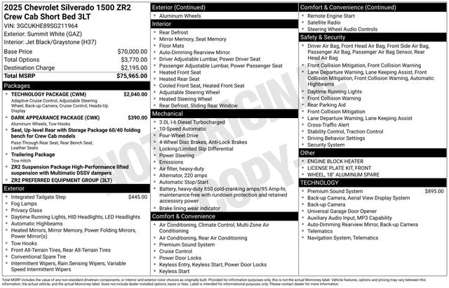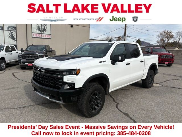Get ready to hit the road in this Chevrolet Silverado 1500, a standout choice for drivers looking for reliability, performance, and style! This impressive vehicle is packed with premium features designed to make every drive more enjoyable. Plus, youâll enjoy a $1,000 finance savings, already included in the sale price, when you finance through one of our trusted lending partners. Whether youâre searching for used cars in Salt Lake City, a dependable SUV, or a powerful truck, this Chevrolet Silverado 1500 delivers everything you need and more. Visit Salt Lake Valley Chrysler Dodge Jeep Ram today to test drive or explore our entire selection of quality pre-owned vehicles. Donât wait - shop online at www.slvcdjr.com or call 801-484-8755 to learn more! This amazing vehicle comes loaded with options like Dark Appearance Package (Front Frame-Mounted Black Recovery Hooks and Wheels: 18" x 8.5" Gloss Black), Preferred Equipment Group 3LT (10-Way Power Driver Seat w/Lumbar, 10-Way Power Passenger Seat Adjuster w/Lumbar, 12.3" Multicolor Reconfigurable Digital Display, 120-Volt Bed Mounted Power Outlet, 120-Volt Interior Power Outlet, 2 USB Data Ports, 2nd Row Heated Outboard Seats, All-Weather Floor Liner (LPO), Auto-Dimming Inside Rear-View Mirror, Bed View Camera, Bluetooth® For Phone, Chevytec Spray-On Black Bedliner, Color-Keyed Carpeting Floor Covering, Deep-Tinted Glass, Driver Memory, Dual Rear USB Ports (Charge Only), Electric Rear-Window Defogger, Electronic Cruise Control, EZ Lift Power Lock & Release Tailgate, Floor Mounted Center Console, Front LED Fog Lamps, Front Rain-Sensing Wipers, HD Surround Vision, Heated Driver & Front Outboard Passenger Seats, Heated Steering Wheel, Heavy-Duty Air Filter, High Gloss Black Mirror Caps, Hill Descent Control, Hitch Guidance w/Hitch View, In-Vehicle Trailering System App, Integrated Trailer Brake Controller, Keyless Open & Start, LED Cargo Area Lighting, Manual Tilt/Telescoping Steering Column, OnStar Services Capable, Outside Heated Power-Adjustable Mirrors, Performance Red Recovery Hooks, Perimeter Lighting, Power Front Passenger Windows w/Express Up/Down, Power Front Windows w/Driver Express Up/Down, Power Rear Windows w/Express Down, Power Sliding Rear Window w/Rear Defogger, Rear Cross Traffic Braking, Rear Pedestrian Alert, Rear Wheelhouse Liners, Remote Vehicle Starter System, Safety Alert Seat, SiriusXM w/360L Trial Subscription, Standard Tailgate, Steering Wheel Audio Controls, Teen Driver, Theft Deterrent System (Unauthorized Entry), Tire Pressure Monitoring System, Trailer Camera Provisions, Trailer Side Blind Zone Alert, Ultrasonic Front & Rear Park Assist, Universal Home Remote, Ventilated Driver & Front Passenger Seats, Wi-Fi Hot Spot Capable, and Wrapped Steering Wheel), Technology Package (15" Diagonal Multicolor Head-Up Display, Adaptive Cruise Control, Power Tilt & Telescoping Steering Column, and Rear Camera Mirror), Trailering Package (Hitch Guidance), Up-Level Rear Seat w/Storage Package, ZR2 Suspension Package, 220 Amp Alternator, 3.23 Rear Axle Ratio, 4-Wheel Disc Brakes, 7 Speakers, 850 Cold-Cranking Amps Heavy-Duty Battery, ABS brakes, Air Conditioning, Alloy wheels, AM/FM radio: SiriusXM with 360L, Apple CarPlay/Android Auto, Auto High-beam Headlights, Auto-dimming door mirrors, Auto-dimming Rear-View mirror, Automatic Emergency Braking, Automatic temperature control, Block heater, Brake assist, Compass, Delay-off headlights, Driver door bin, Driver vanity mirror, Dual Exhaust, Dual front impact airbags, Dual front side impact airbags, Electronic Stability Control, Electronic Transmission Range Selector Shifter, Emergency communication system: OnStar, Engine Block Heater, Following Distance Indicator, Forward Collision Alert, Front anti-roll bar, Front Bucket Seats, Front Center Armrest, Front dual zone A/C, Front fog lights, Front License Plate Kit, Front Pedestrian Braking, Front reading lights, Front wheel independent suspension, Fully automatic head