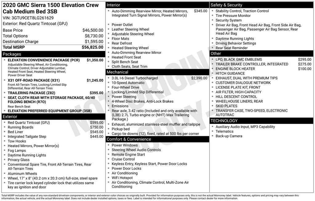 Red Quartz Tintcoat 2020 GMC Sierra 1500 Elevation 4WD 10-Speed Automatic 3.0L I6 10-Speed Automatic, 4WD, Dark Walnut/Slate Cloth.Recent Arrival! 22/26 City/Highway MPGCheck out our 5 Star Google Reviews! Drive a little save a lot. Sale Price Includes $1,000 Finance Savings. Contact Dealer For Details.