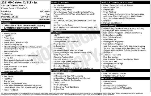 Take your drives to the next level with this GMC Yukon XL from Salt Lake Valley Buick GMC! Engineered for a smooth ride, advanced convenience, and lasting dependability, this vehicle is ready to handle everything your day throws at you. Plus, enjoy a $1,000 finance savings, already included in the sale price, when you finance through one of our trusted lending partners. Looking for quality used cars in Salt Lake City? This GMC Yukon XL delivers style, versatility, and value - perfect for daily commutes, family trips, or weekend adventures. Stop by Salt Lake Valley Buick GMC to see this vehicle in person and explore our wide selection of pre-owned cars, trucks, and SUVs. Browse online at www.slvbuickgmc.com or call 801-265-1511 to schedule your test drive today! With License Plate Front Mounting Package, Preferred Equipment Group 4SA (12-Way Power Seat Adjusters, 2 Presets For Power Driver Seat, Bose 9-Speaker Stereo Audio System Feature, Bright Chrome Bodyside Moldings, Bright Front & Rear Door Sill Plates, Chrome Door Handles w/Body-Color Strip, Hands-Free Power Programmable Rear Liftgate, Heated & Ventilated Driver & Front Passenger Seats, Heated Driver & Front Passenger Seats, Inside Rear-View Auto-Dimming Mirror, Safety Alert Seat, and Universal Home Remote), 3.23 Rear Axle Ratio, 3rd row seats: split-bench, 4-Wheel Disc Brakes, 9 Speakers, ABS brakes, Air Conditioning, Alloy wheels, AM/FM radio: SiriusXM with 360L, Apple CarPlay/Android Auto, Auto High-beam Headlights, Auto-dimming Rear-View mirror, Automatic Emergency Braking, Automatic temperature control, Bodyside moldings, Brake assist, Bumpers: body-color, Compass, Delay-off headlights, Driver door bin, Driver vanity mirror, Dual front impact airbags, Dual front side impact airbags, Electronic Stability Control, Emergency communication system: OnStar and GMC connected services capable, Following Distance Indicator, Forward Collision Alert, Four wheel independent suspension, Front & Rear Park Assist, Front anti-roll bar, Front Bucket Seats, Front Center Armrest, Front dual zone A/C, Front fog lights, Front Pedestrian Braking, Front reading lights, Fully automatic headlights, Garage door transmitter, HD Radio, Heated door mirrors, Heated front seats, Illuminated entry, IntelliBeam Automatic High Beam On/Off, Lane Change Alert w/Side Blind Zone Alert, Lane Keep Assist w/Lane Departure Warning, Leather steering wheel, Low tire pressure warning, Memory seat, Occupant sensing airbag, Outside temperature display, Overhead airbag, Overhead console, Panic alarm, Passenger door bin, Passenger vanity mirror, Perforated Leather Seating Surfaces, Power door mirrors, Power driver seat, Power Liftgate, Power passenger seat, Power steering, Power windows, Premium Smooth Ride Suspension, Radio: AM/FM/SiriusXM, Rain sensing wipers, Rear air conditioning, Rear anti-roll bar, Rear Cross Traffic Alert, Rear reading lights, Rear seat center armrest, Rear window defroster, Rear window wiper, Remote keyless entry, Roof rack: rails only, Security system, SiriusXM w/360L, Speed control, Speed-sensing steering, Split folding rear seat, Spoiler, Steering wheel mounted audio controls, Tachometer, Telescoping steering wheel, Tilt steering wheel, Traction control, Trip computer, Variably intermittent wipers, Ventilated front seats, Voltmeter, and Wheels: 20 x 9 6-Spoke Polished Aluminum designed for convenience and enjoyment, this GMC Yukon XL is ready to take you wherever you want to go.
