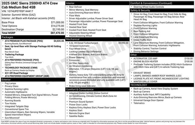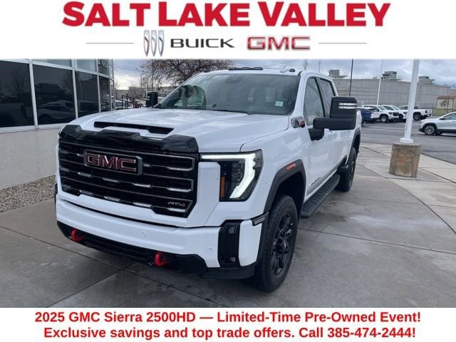 Take your drives to the next level with this GMC Sierra 2500HD from Salt Lake Valley Buick GMC! Engineered for a smooth ride, advanced convenience, and lasting dependability, this vehicle is ready to handle everything your day throws at you. Plus, enjoy a $1,000 finance savings, already included in the sale price, when you finance through one of our trusted lending partners. Looking for quality used cars in Salt Lake City? This GMC Sierra 2500HD delivers style, versatility, and value - perfect for daily commutes, family trips, or weekend adventures. Stop by Salt Lake Valley Buick GMC to see this vehicle in person and explore our wide selection of pre-owned cars, trucks, and SUVs. Browse online at www.slvbuickgmc.com or call 801-265-1511 to schedule your test drive today! With AT4 Preferred Package (LED Smoked Amber Roof Marker Lamps, Power Sliding Rear Window w/Defogger, and Universal Home Remote), AT4 Premium Plus Package (Off-Road High Clearance Step (LPO) and Power Sunroof), Preferred Equipment Group 4SB (120-Volt Bed Mounted Power Outlet, 120-Volt Instrument Panel Power Outlet, 2 Charge-Only Rear USB Ports, 2 Charge/Data USB Ports Inside Center Console, 2 USB Ports, 2-Speed Active Transfer Case, Bed View Camera w/2 Trailer Camera Provisions, Bose Premium 7-Speaker Sound System, Deep-Tinted Glass, Electric Rear-Window Defogger, Floor-Mounted Center Console, Front Prem Floor Liners w/Removable Carpet Insert, Front Rain-Sensing Wipers, Gloss Black Header Grille & Grille Insert Bars, HD Surround Vision, Heated 2nd Row Outboard Seats, Heated Driver & Front Outboard Passenger Seats, Keyless Open & Start, LED Cargo Area Lighting, Manual Tilt-Wheel/Telescoping Steering Column, OnStar Services Capable, Power Front Passenger Windows w/Express Up/Down, Push Button Start, Rear Cross Traffic Alert, Rear Prem Floor Liners w/Removable Carpet Insert, Rear Wheelhouse Liners, Remote Vehicle Starter System, Safety Alert Seat, SiriusXM w/360L Trial Subscription, Spray-On Pickup Bedliner w/GMC Logo, Steering Wheel Audio Controls, Trailer Cam Provisions & Trailer Viewing Software, Trailer Side Blind Zone Alert, Ultrasonic Front & Rear Park Assist, Unauthorized Entry Theft-Deterrent System, Ventilated Driver & Front Passenger Seats, Wireless Charging, and Wireless Phone Projection), Technology Package (Inside Rearview Auto-Dimming Rear Camera Mirror and Multicolor 15 Diagonal Head-Up Display), X31 Off-Road Package (Hill Descent Control), 10-Way Power Driver Seat Adjuster w/Lumbar, 10-Way Power Passenger Seat Adjuster w/Lumbar, 220-Amp Alternator, 4-Wheel Disc Brakes, 7 Speakers, ABS brakes, Air Conditioning, Alloy wheels, AM/FM radio: SiriusXM with 360L, Apple CarPlay/Android Auto, Auto High-beam Headlights, Auto-dimming door mirrors, Auto-dimming Rear-View mirror, Automatic Emergency Braking, Automatic temperature control, Brake assist, Buckle to Drive, Bumpers: body-color, Compass, Delay-off headlights, Driver door bin, Driver Memory, Driver vanity mirror, Dual front impact airbags, Dual front side impact airbags, Electronic Stability Control, Emergency communication system: OnStar, Engine Block Heater, Exhaust Brake, Following Distance Indicator, Forward Collision Alert, Front anti-roll bar, Front Bucket Seats, Front Center Armrest, Front dual zone A/C, Front fog lights, Front License Plate Kit, Front Pedestrian Braking, Front reading lights, Front wheel independent suspension, Fully automatic headlights, Heated door mirrors, Heated front seats, Heated rear seats, Heated steering wheel, Heavy-Duty 80 Amp Battery, Hitch Guidance w/Hitch View, Illuminated entry, In-Vehicle Trailering System App, IntelliBeam Automatic High Beam On/Off, Lane Departure Warning System, Low tire pressure warning, Memory seat, Occupant sensing airbag, Off-Road Suspension, Outside temperature display, Overhead airbag, Overhead console, Panic alarm, Passenger door bin, Passenger vanity mirror, Perforated Leather-Appoint