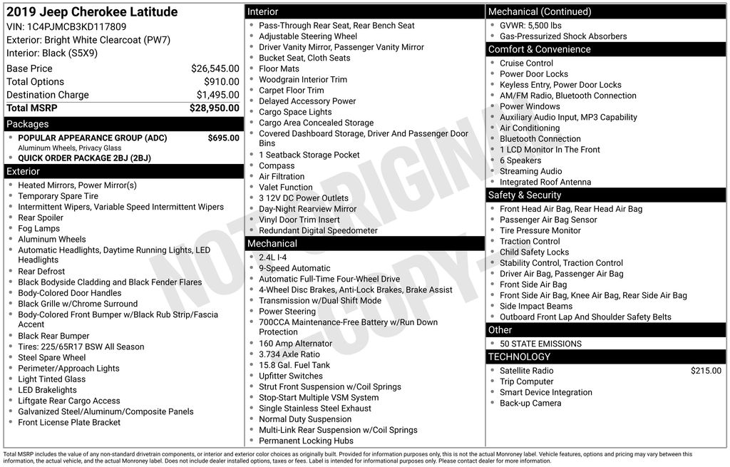 Bright White Clearcoat 2019 Jeep Cherokee Latitude 4WD 9-Speed 948TE Automatic 2.4L I4