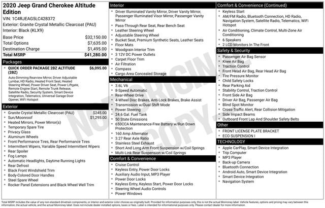 Take your drives to the next level with this Jeep Grand Cherokee from Salt Lake Valley Buick GMC! Engineered for a smooth ride, advanced convenience, and lasting dependability, this vehicle is ready to handle everything your day throws at you. Price excludes tax, title, license fee, government fees, and $449 dealer documentary service fee. While every reasonable effort is made to ensure accuracy, we are not responsible for errors or omissions, and vehicles may be sold prior to inquiry please contact the dealer to confirm availability. All financing is subject to approved credit. Looking for quality used cars in Salt Lake City? This Jeep Grand Cherokee delivers style, versatility, and value - perfect for daily commutes, family trips, or weekend adventures. Stop by Salt Lake Valley Buick GMC to see this vehicle in person and explore our wide selection of pre-owned cars, trucks, and SUVs. Browse online at www.slvbuickgmc.com or call 801-265-1511 to schedule your test drive today! With Quick Order Package 2BZ Altitude (1-Year SiriusXM Guardian Trial, 1-Year SiriusXM Radio Service, 4G LTE Wi-Fi Hot Spot, 5-Year SiriusXM Traffic Service, 5-Year SiriusXM Travel Link Service, 8.4 Touchscreen Display, Altitude Grille, Apple CarPlay, Auto-Dimming Rear-View Mirror, Black Suede Seats w/Black Stitching, Body Color Claddings, Body Color Fascia, Body Color Shark Fin Antenna, Dark Day Light Opening Moldings, Dark Headlamp Bezel Finish, Dark Lens Taillamps, Disassociated Touchscreen Display, For Details, Visit DriveUconnect.com, Front Accent/Body Color Fascia, Gloss Black Rear Fascia Applique, Google Android Auto, GPS Antenna Input, GPS Navigation, HD Radio, Integrated Center Stack Radio, Integrated Voice Command w/Bluetooth, Jeep Black Gloss Badging, Power 4-Way Driver Lumbar Adjust, Power 8-Way Driver/Manual Passenger Seat, Radio: Uconnect 4C Nav w/8.4 Display, Rear Accent/Body Color Fascia, Rear Fascia Black MIC Step Pad, Single Exhaust w/Bright Tip, SiriusXM Satellite Radio, SiriusXM Traffic Plus, SiriusXM Travel Link, Steering Wheel Mounted Audio Controls, USB Host Flip, and Wheels: 20 x 8.0 Gloss Black Aluminum), Security & Convenience Group (115V Auxiliary Power Outlet, Heated Steering Wheel, Security Alarm, and Universal Garage Door Opener), 3.27 Rear Axle Ratio, 4-Wheel Disc Brakes, 6 Speakers, ABS brakes, Air Conditioning, Alloy wheels, AM/FM radio, Anti-whiplash front head restraints, Apple CarPlay/Android Auto, Automatic temperature control, Brake assist, Bumpers: body-color, Cloth Bucket Seats, Compass, Delay-off headlights, Driver door bin, Driver vanity mirror, Dual front impact airbags, Dual front side impact airbags, Eco Suspension I, Electronic Stability Control, Four wheel independent suspension, Front anti-roll bar, Front Bucket Seats, Front Center Armrest w/Storage, Front dual zone A/C, Front fog lights, Front License Plate Bracket, Front reading lights, Fully automatic headlights, Heated door mirrors, Illuminated entry, Knee airbag, Leather Shift Knob, Low tire pressure warning, Occupant sensing airbag, Outside temperature display, Overhead airbag, Overhead console, Panic alarm, ParkView Rear Back-Up Camera, Passenger door bin, Passenger vanity mirror, Power door mirrors, Power steering, Power Sunroof, Power windows, Radio data system, Rear anti-roll bar, Rear reading lights, Rear seat center armrest, Rear window defroster, Rear window wiper, Remote keyless entry, Speed control, Speed-sensing steering, Speed-Sensitive Wipers, Split folding rear seat, Spoiler, Steering wheel mounted audio controls, Tachometer, Telescoping steering wheel, Tilt steering wheel, Traction control, Trip computer, Variably intermittent wipers, and Wheels: 17 x 8.0 Silver Aluminum designed for convenience and enjoyment, this Jeep Grand Cherokee is ready to take you wherever you want to go.